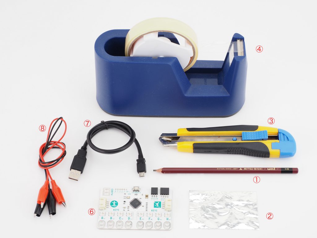 文豪ペンシルをつくるのに必要なのは、次のような材料だ。 キータッチ本体やワニ口ケーブルなどは、この連載の専用キット「KoKa KeyTouchクリエイターBOX」に入っているよ。