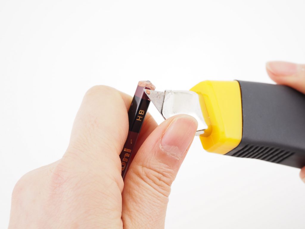 の部分に、ワニ口ケーブルをつなげるよ。その前に、配線しやすいように鉛筆のおしり(書くのとは反対側)を浅く削ろう。鉛筆削りを使ってもいいけど、芯を太めに残したいので、カッターで削る方法を習っていたら、カッターの方がやりやすいよ。ただし、ケガをしないように注意してね。