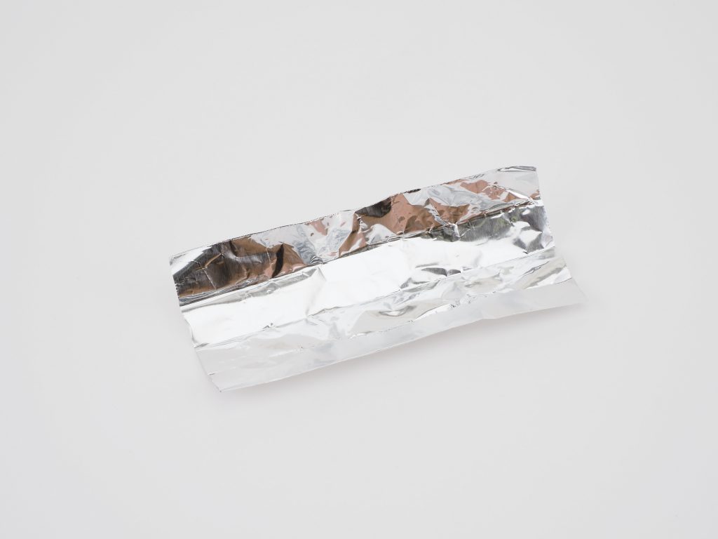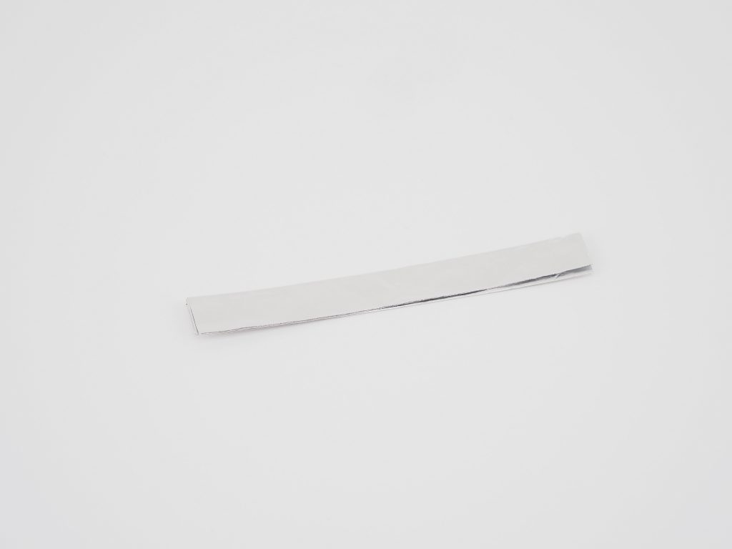 アルミホイルを折りたたんで、細長くするよ。短い5cmのほうから、だいたい1cmの幅で5回折りたたむよ。折りたたむことでやぶれないようにしているんだ。