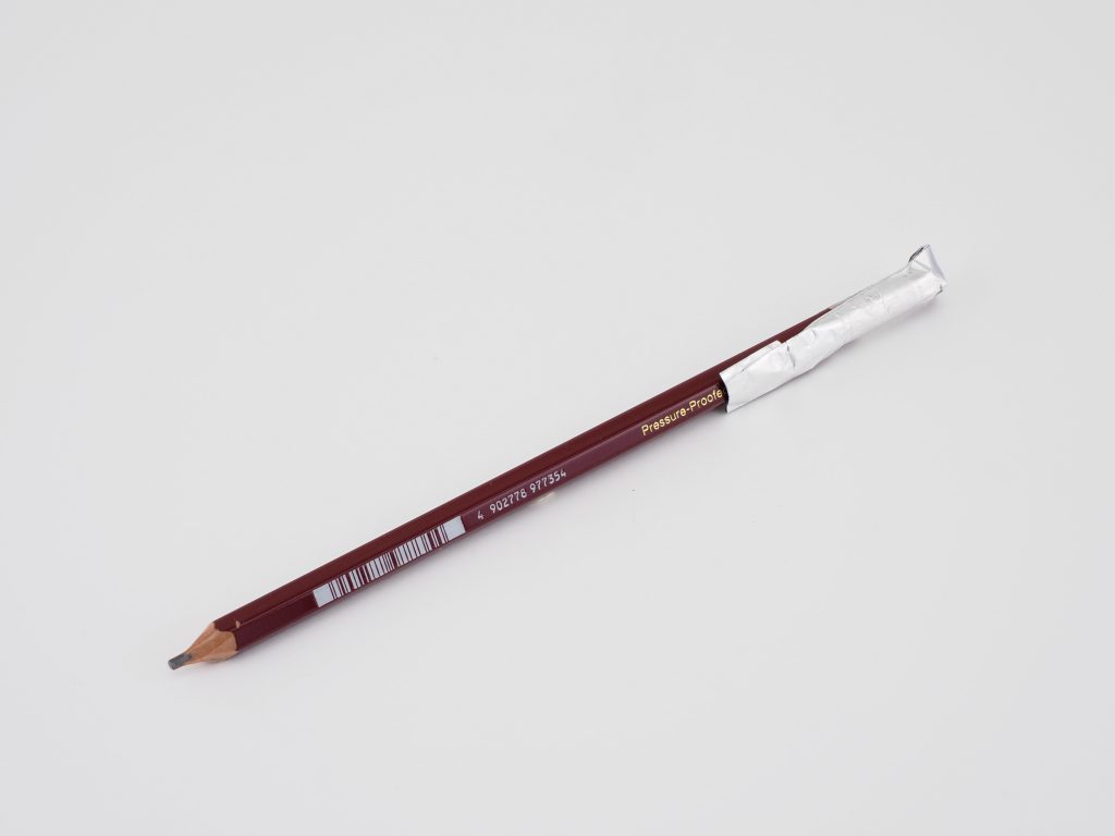 鉛筆にアルミホイルを巻き付けたら、おしりの部分のアルミホイルを押し付ける感じでつぶして、密着