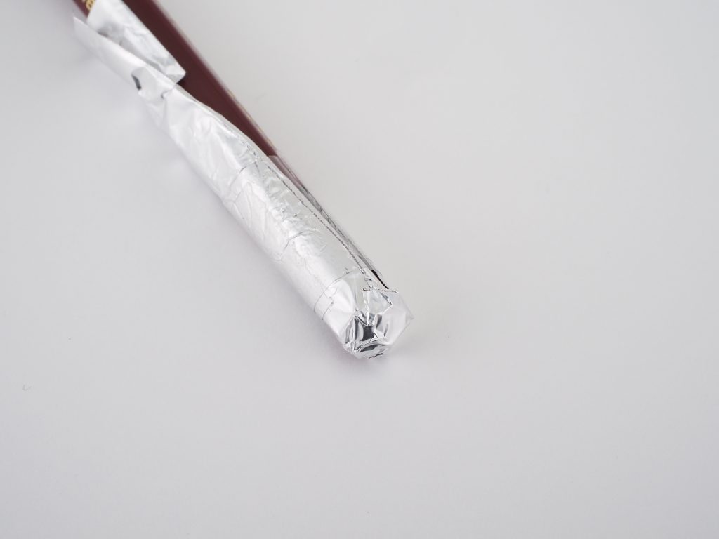 折りたたんだアルミホイルをテーブで鉛筆のおしりにまく。写真を参考にして、片方が長くなるようにして、セロハンテープで止めよう。セロハンテープは短いほうのアルミホイルに合わせて貼り付けるようにしてね。