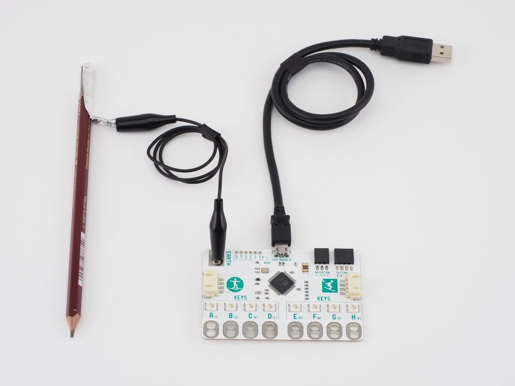 鉛筆にアルミホイルを巻き付けたら、キータッチにつなげよう。鉛筆のおしりに貼ったアルミホイルで、長く残しておいたほうに黒のワニ口ケーブルをつなげるよ。反対側のクリップは、キータッチの「EARTH」につなごう。