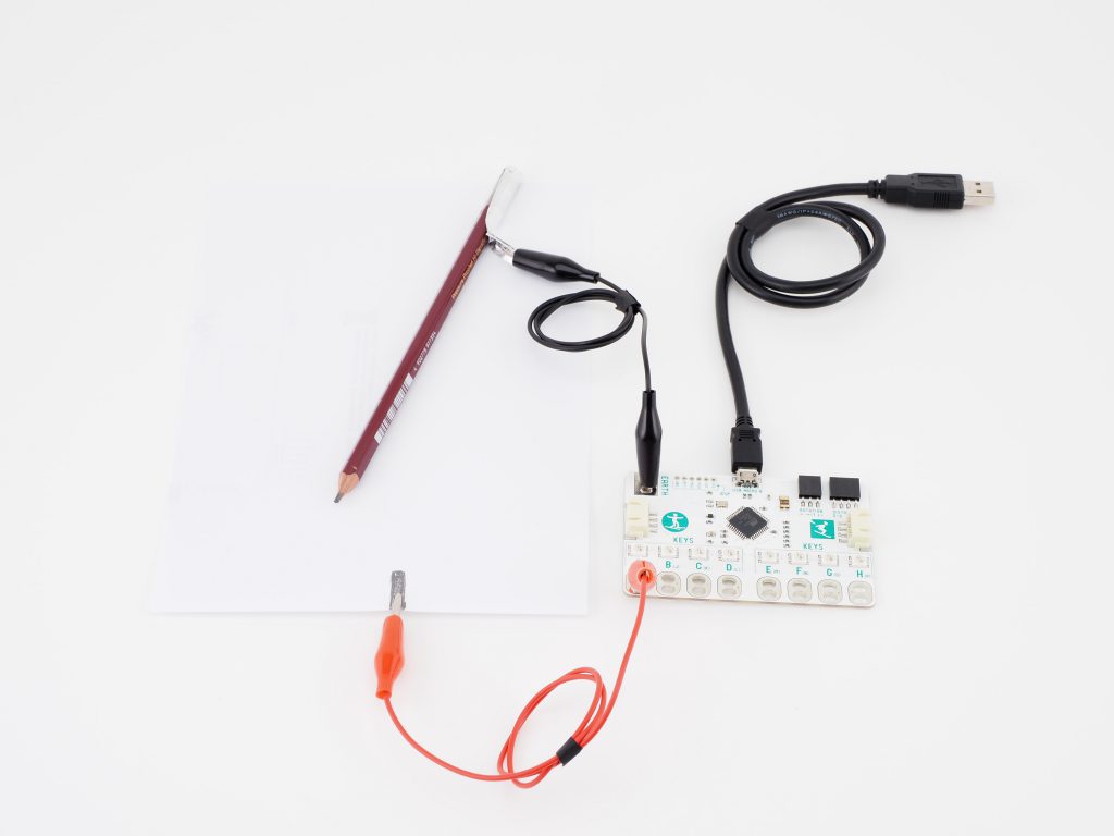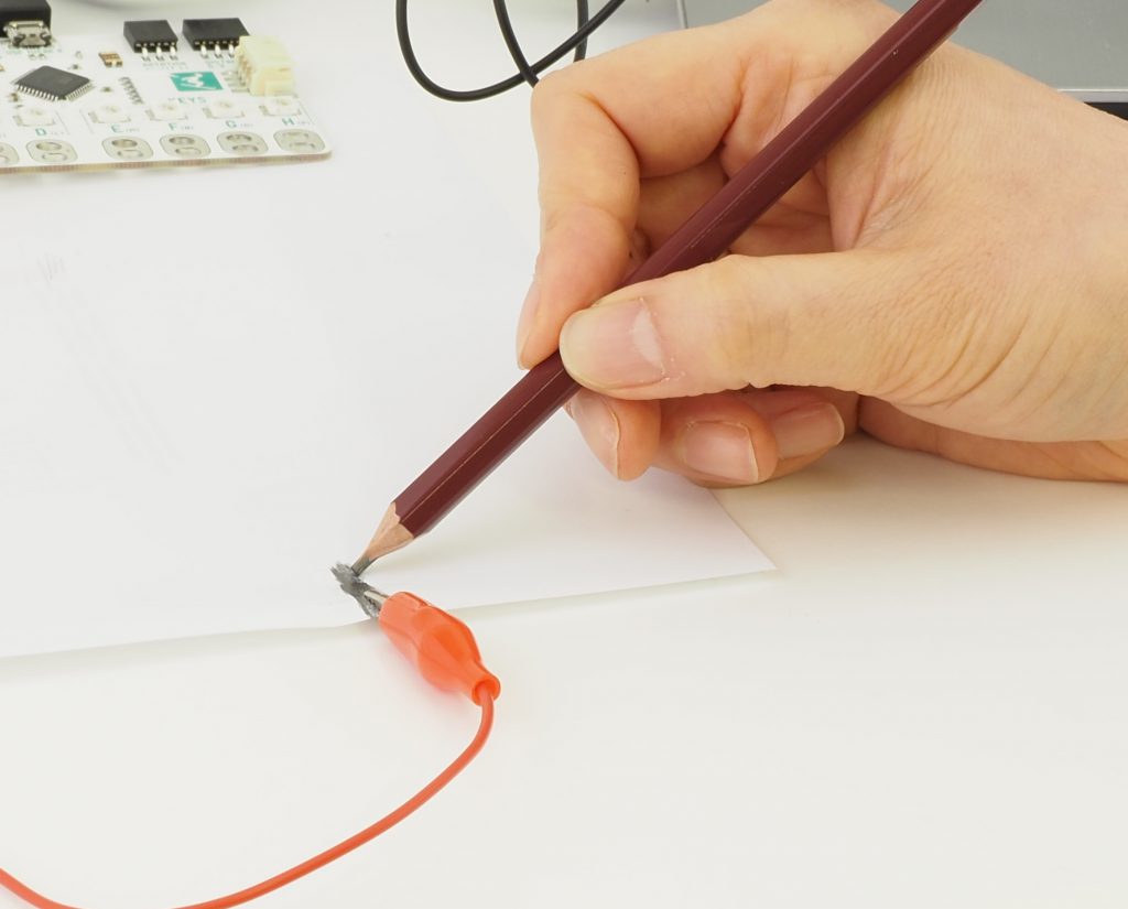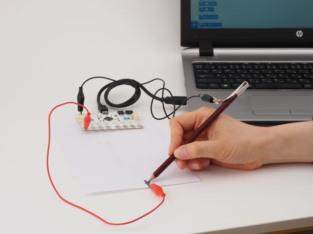 鉛筆の芯は、黒鉛が使われているので電気を通す。また、紙の上に書いた鉛筆の跡も同じように電気を通すよ。電気が通るものであればキータッチをつないて、パソコンに信号を送ることができる。この特性を利用して、紙に鉛筆で書いた跡