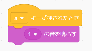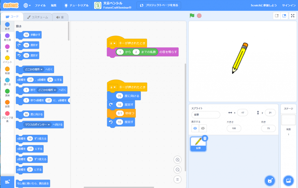 音の素材だけ設定したファイルをスクラッチのサイトに用意しているので、こちらからScratchを開いてね。 ここにあるプログラムは、鉛筆を紙でこすっているような音が「鉛筆」のスプライトに設定されているものだ。鉛筆をキータッチの「A」の端子に接続しているので、スクラッチのプログラムでは「aのキーが押されたとき」ブロックに、音を鳴らすブロックを組み合わせているよ。音は「1」と「2」が選べるので、好きなほうを選んでみて試してみよう。
