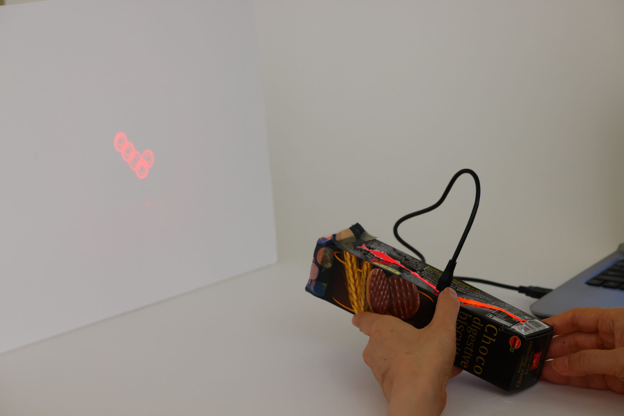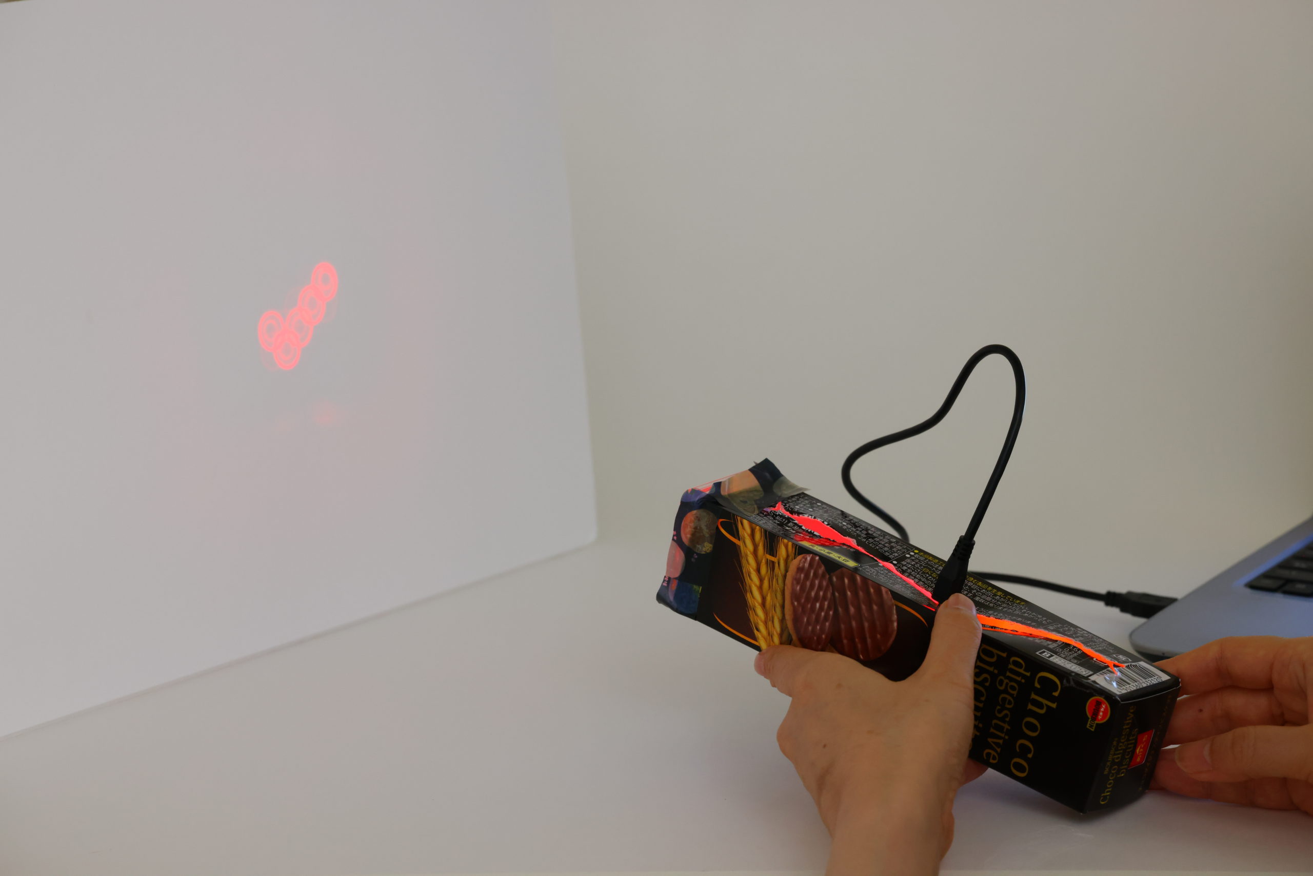前回つくったオリジナルプロジェクターで映したのが、下の写真だ。アニメーションみたいな感じだったよ。キミもぜひやってみてね。