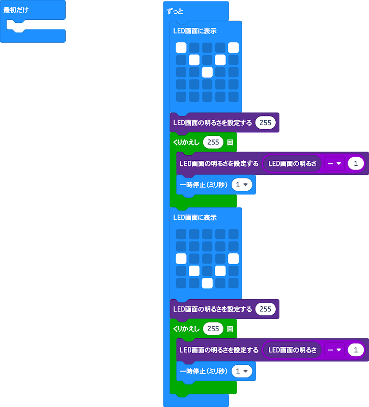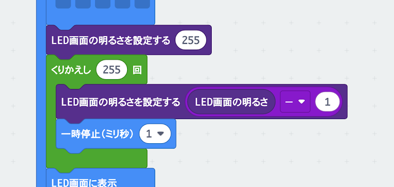 「ループ」カテゴリーの「くりかえし( )回」ブロックを使って、じわりと暗くなるようなプログラムにしたよ。「LED画面の明るさを設定する(255)」ブロックの(255)に、「計算」カテゴリーの「(0)-(0)」ブロックを入れている。「LED画面の明るさ」を1ずつ引いているよ。