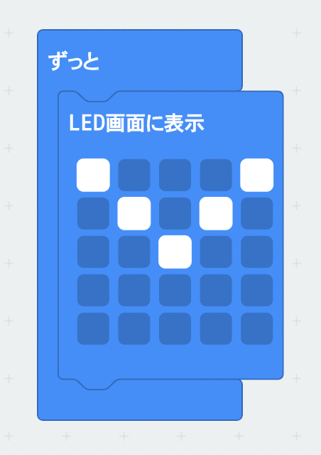 まずは 「基本」カテゴリーの「LED画面に表示」ブロックを使ってみるぞ。MakeCodeを使いこなしているキミならすぐ思いつくだろう。このブロックは四角い穴をクリックして点灯させたいLEDを指定できるぞ。
