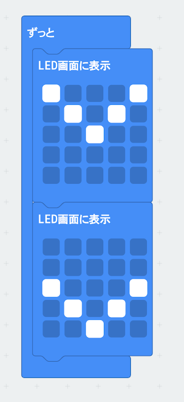 それではこのブロックを使って、「LED画面に表示」ブロックでつくったプログラムを少し改造してみよう。「LED画面に表示」ブロックの下に「LED画面の明るさを設定する(255)」ブロックを追加すると、表示が暗くなる動きになるはずだ。