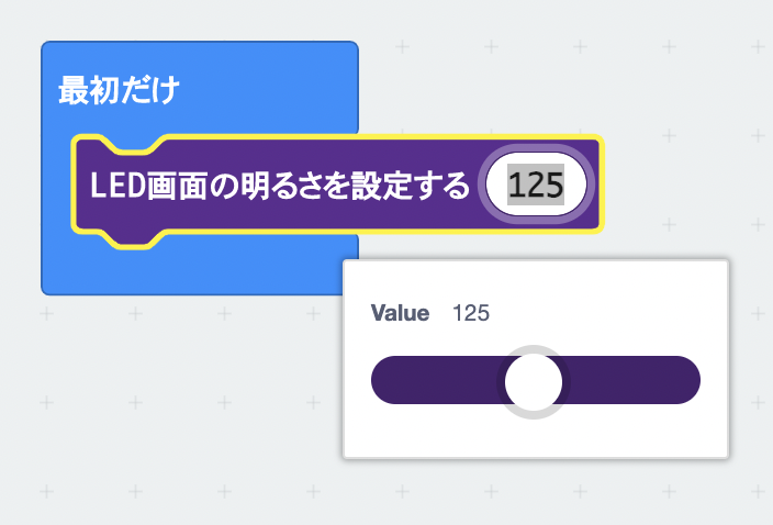 「LED」カテゴリーの「その他」にある、「LED画面の明るさを設定する(255)」というブロックを使ったことがあるかな? ためしに「最初だけ」ブロックと組み合わせて、255以外の数字に変更してみよう。数字の部分をクリックすると、スライダーが出て、数字を変えられる。キーボードで数字を直接入力することで変えることもできるよ。
