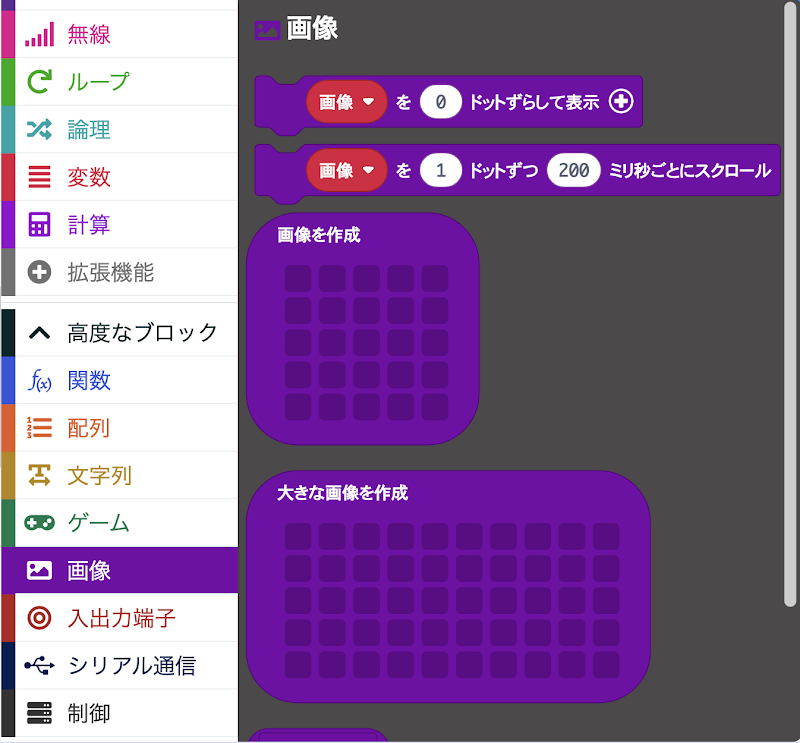 それでは、micro:bitのLED画面に収まらないような、大きな画像を表示するプログラムをつくってみよう。新しくプロジェクトをつくったら、「高度なブロック」をクリックして表示される「画像」カテゴリーを見てみるぞ。