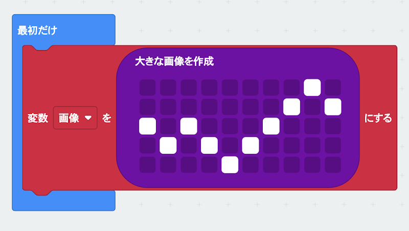 このカテゴリーには、micro:bit のLED画面(5×5)には収まらないくらいの、大きな画像をつくる「大きな画像を作成」ブロックがある。これを使ってみるぞ。このブロックを見てみると上下に他のブロックとつながるための凹凸がない。