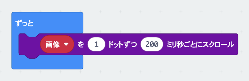 そして「ずっと」ブロックに「(画像)を(1)ドットずつ(200)ミリ秒ごとにスクロール」ブロックを組み合わせて、大きな画像を表示させてみるぞ。一度に全部が表示されないので、自動的にスクロールして表示されたんじゃないかな。