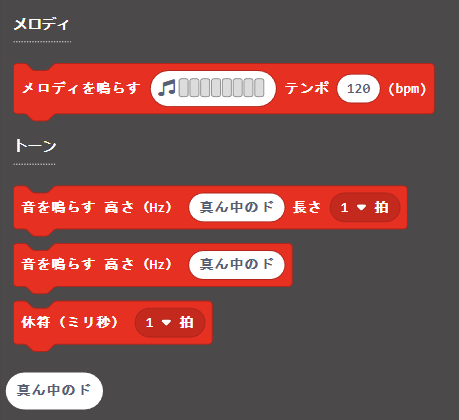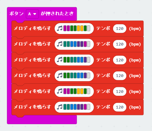 下のように「メロディを鳴らす」ブロックを組み合わせると、曲をつくることもできるぞ。