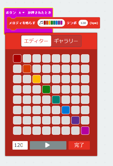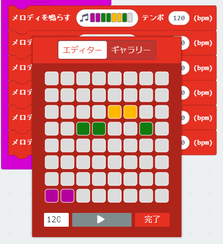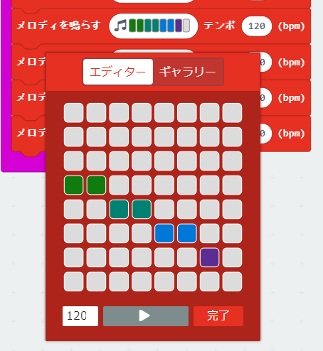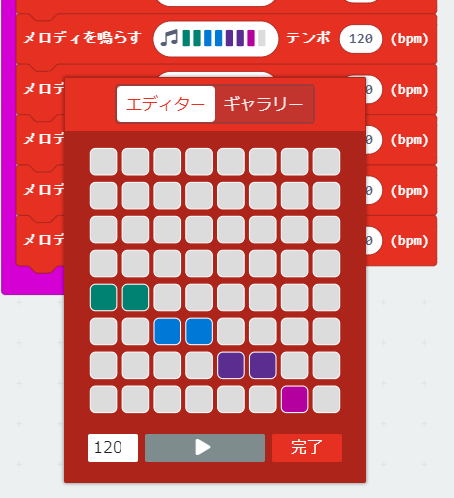まず、「メロディを鳴らす」ブロックを使ってみるぞ。このブロックはあらかじめ入力したメロディを鳴らすことが出来る。メロディは、音符のところをクリックすると表示されるエディターで自由につくることができるけど、ギャラリーから完成している曲を選んでもいい。