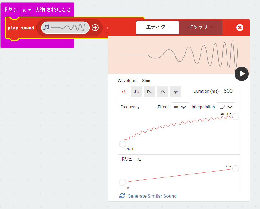 新しいプロジェクトをつくって、ボタンAで「play sound」ブロックで設定した音を鳴らすプログラムをつくるよ。このブロックの、波の模様がある部分をクリックしてみると、波の模様やいろいろな設定画面が表示される。設定画面を見るとなんだかよくわからないけど、いろいろ変更してみながら、どんなことができるのか確認してみよう。