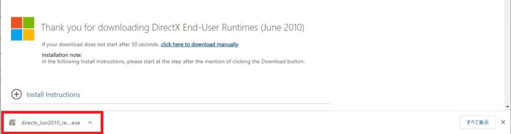するとブラウザの左下、または「ダウンロード」フォルダーの中に、「directx_Jun2010_redist.exe」というファイルがダウンロードされるよ。