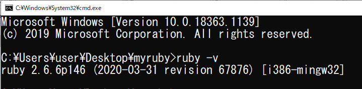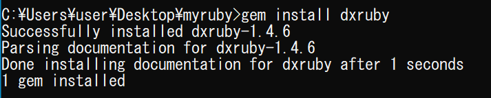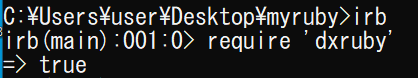 念のため、ちゃんとDxrubyがインストールできたが、確認しておこう。「Myruby」フォルダーからコマンドプロンプトを開いて、以下のように入力してみよう。