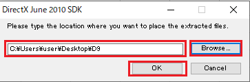 すると、このファイルを解凍するフォルダーを聞いてくるので、「Browse」ボタンをクリックして、先ほどつくったデスクトップ上の「D9」フォルダを選択し、「OK」ボタンをクリックしよう。そうすると、「D9」フォルダーにはたくさんのファイルが展開