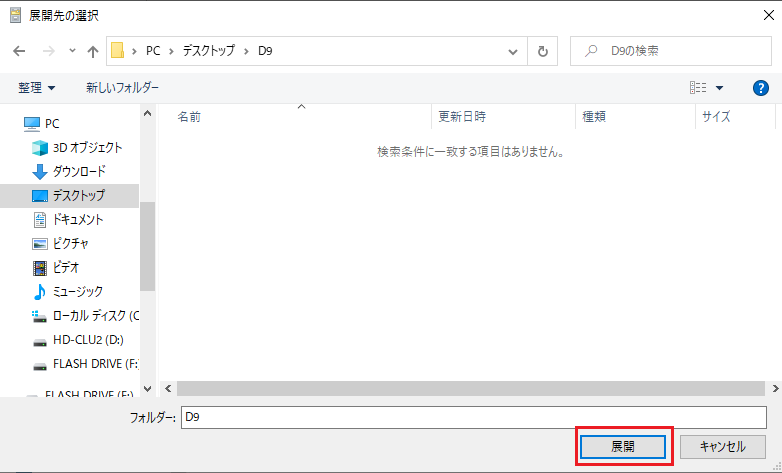 展開するフォルダーを聞いてきたら、「D9」のままで「展開」をクリックする。