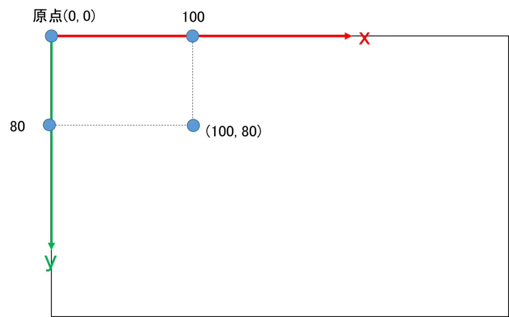 ここで、図形を配置するためにどこの位置にあるのか、ということを(x , y)の2つの数字で表現していて、これを「座標