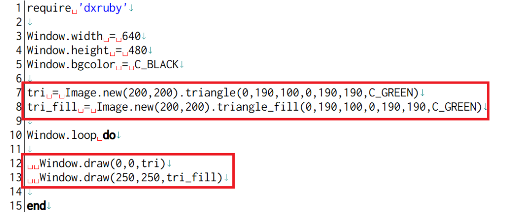 10行目のWindow.loop から、endの中で、定義した三角形を描いている。そこで指定している座標は、Image オブジェクトの左上隅の座標を指定しているんだ。