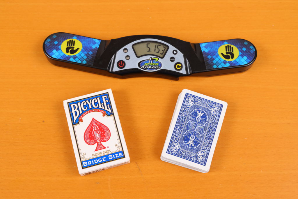 用意するものは、トランプ2パック(記憶用と回答用)とタイマーだけ。時間を計測するタイマーはキッチンタイマーやストップウオッチでもOK。トランプは100円ショップに売っているものでも構いません。上達したら、道具をアップグレードしてもよいでしょう(写真下)。