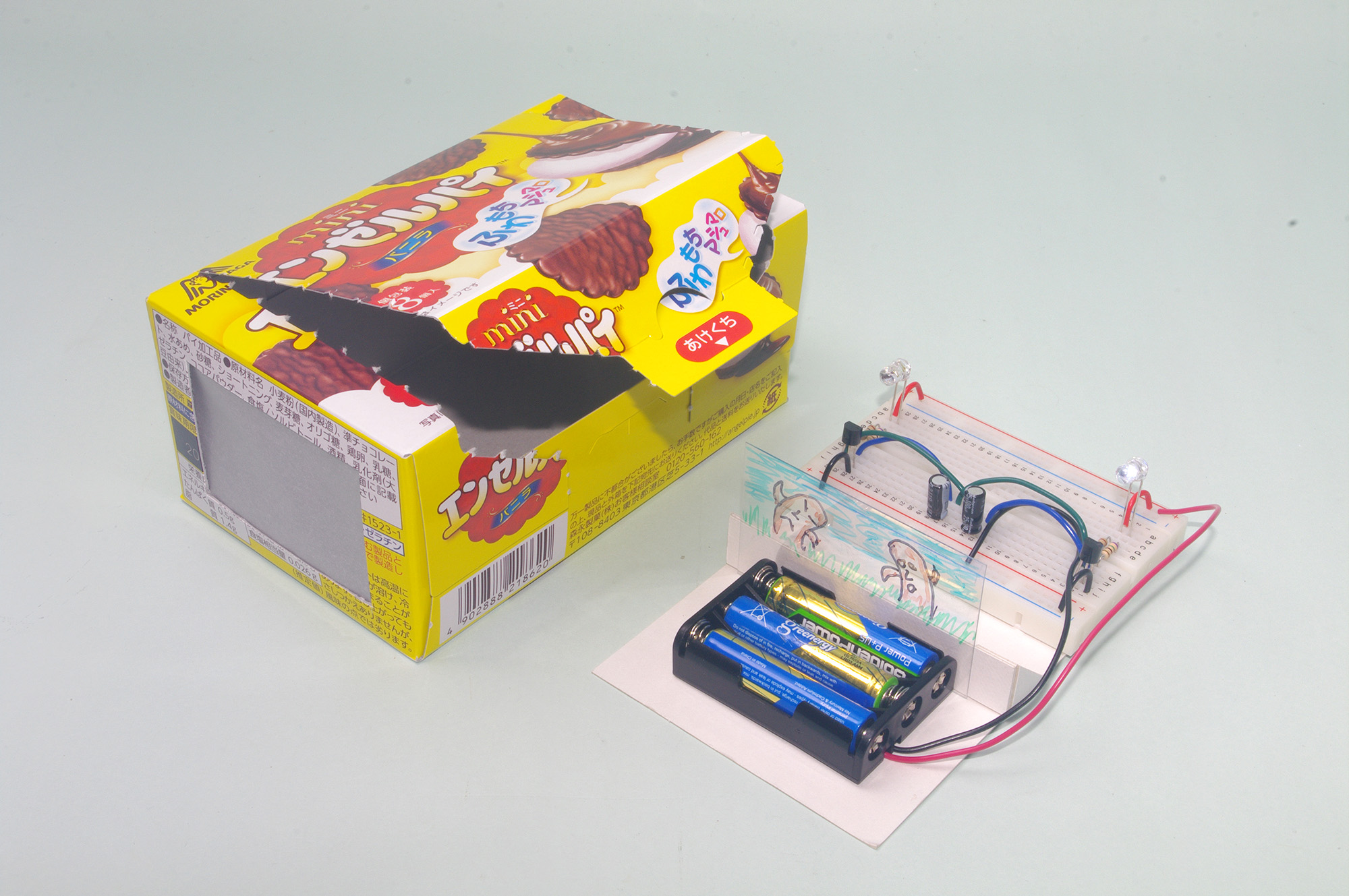 ハンダ付けがいらないブレッドボードを使った電子工作で、自分で描いた2コマアニメを映し出す装置(2023年7月号で紹介したポケデン「パラパラ影絵箱Pi」のブレッドボードバージョン)をつくるワークショップです。
