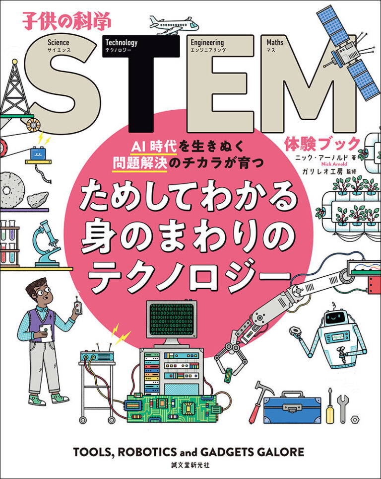 この本は、簡潔な説明とわかりやすいイラストで構成した、STEM教育を実践できるシリーズ。テクノロジー編は、道具や技術の発展を紹介しています。道具の起源である「くさび」にはじまり、力を伝えるしかけや熱を利用する方法、金属や材料の話、モーターや船、飛行機のしくみ、電気、磁石、コンピューター、ロボットなどを解説。工作やものづくりに興味のある子が喜ぶ話題が満載です。