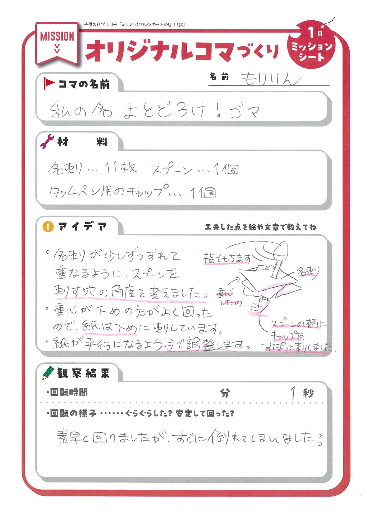 子供の科学2024年1月号別冊付録「科学ミッションカレンダー」1月のミッションページ。今月は身近なもので簡単につくれるオリジナルコマづくりのミッションだ! 完成したら、コマの写真や回っている様子を投稿してね!