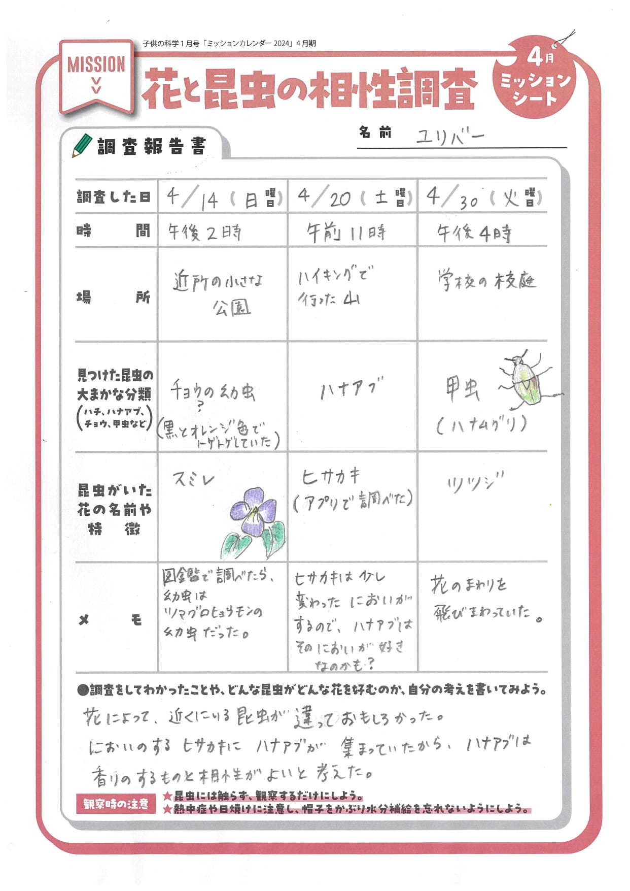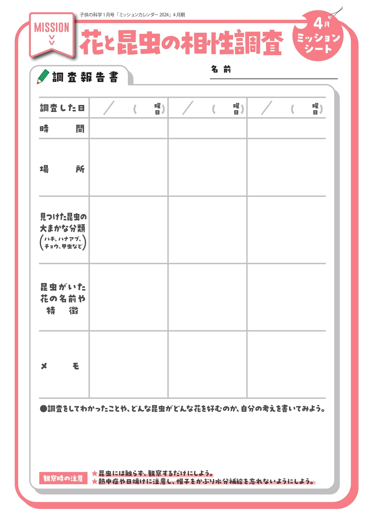 子供の科学2024年1月号別冊付録「科学ミッションカレンダー」4月のミッションページ。だんだんと暖かくなってきた今月は、花と昆虫の相性を調査するミッションだ!
