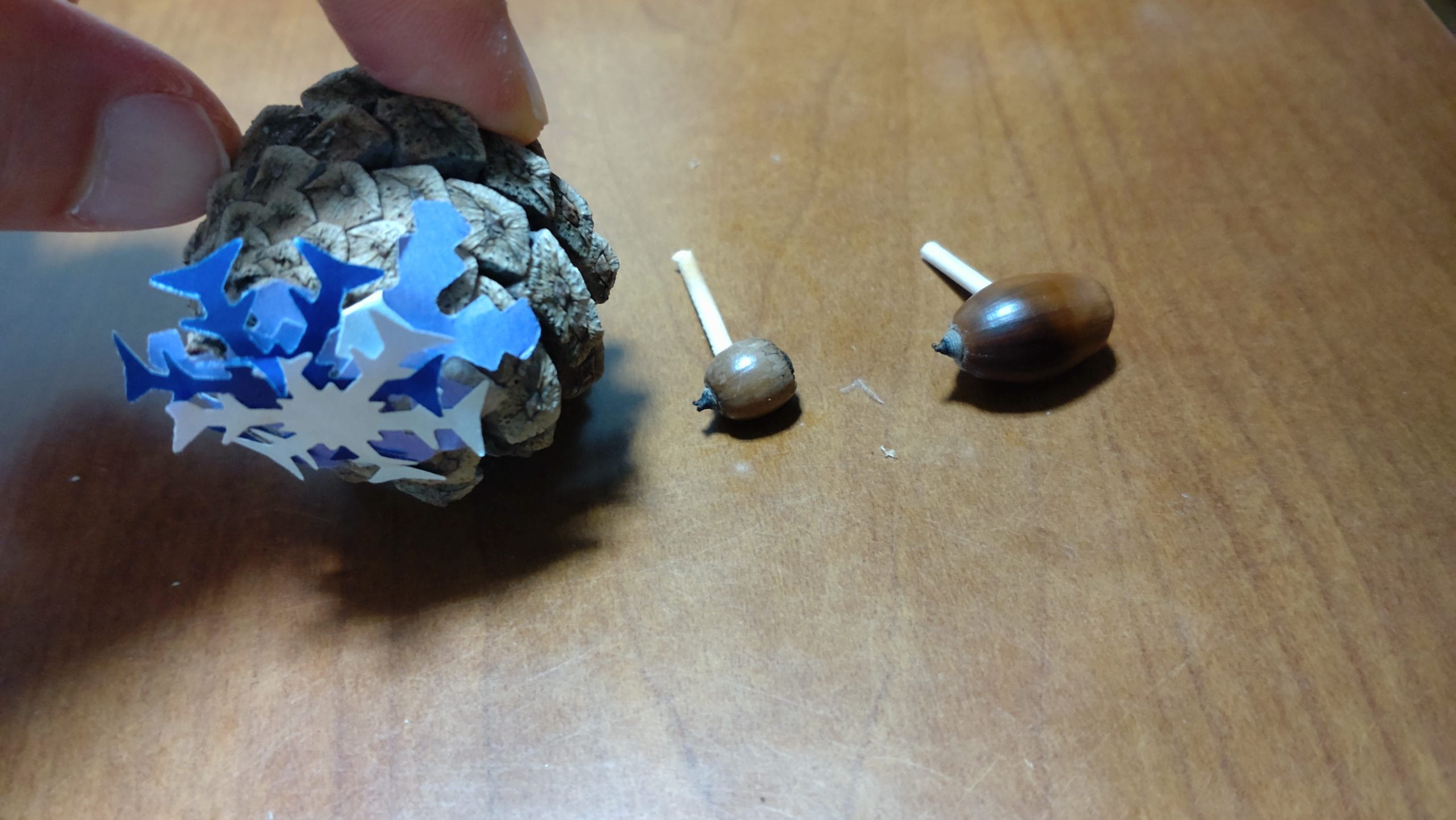 近くの公園で拾ったものと、防災科学研究所でもらった雪の結晶の折り紙を組み合わせたもので作りました。