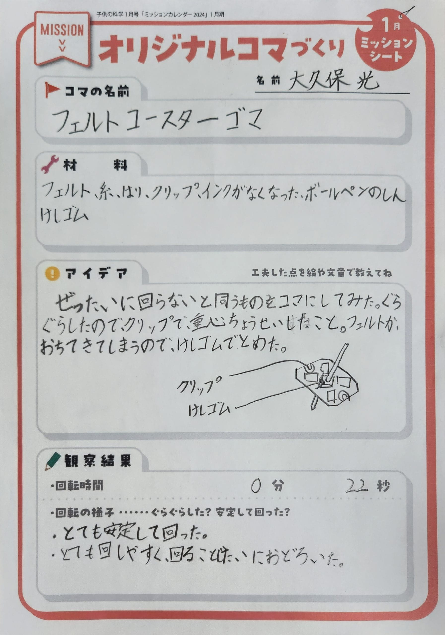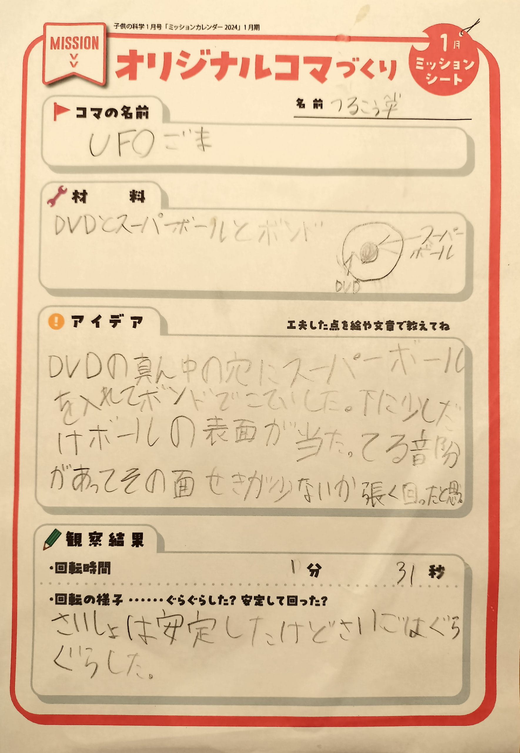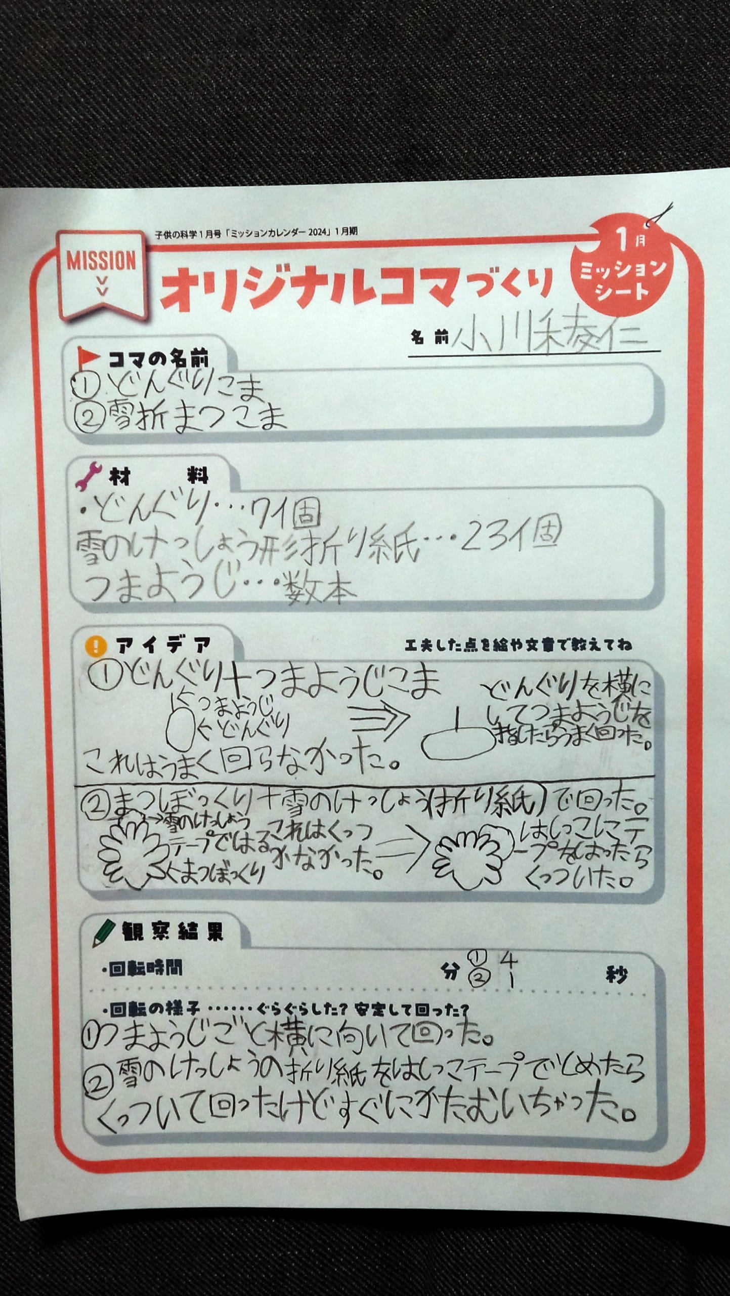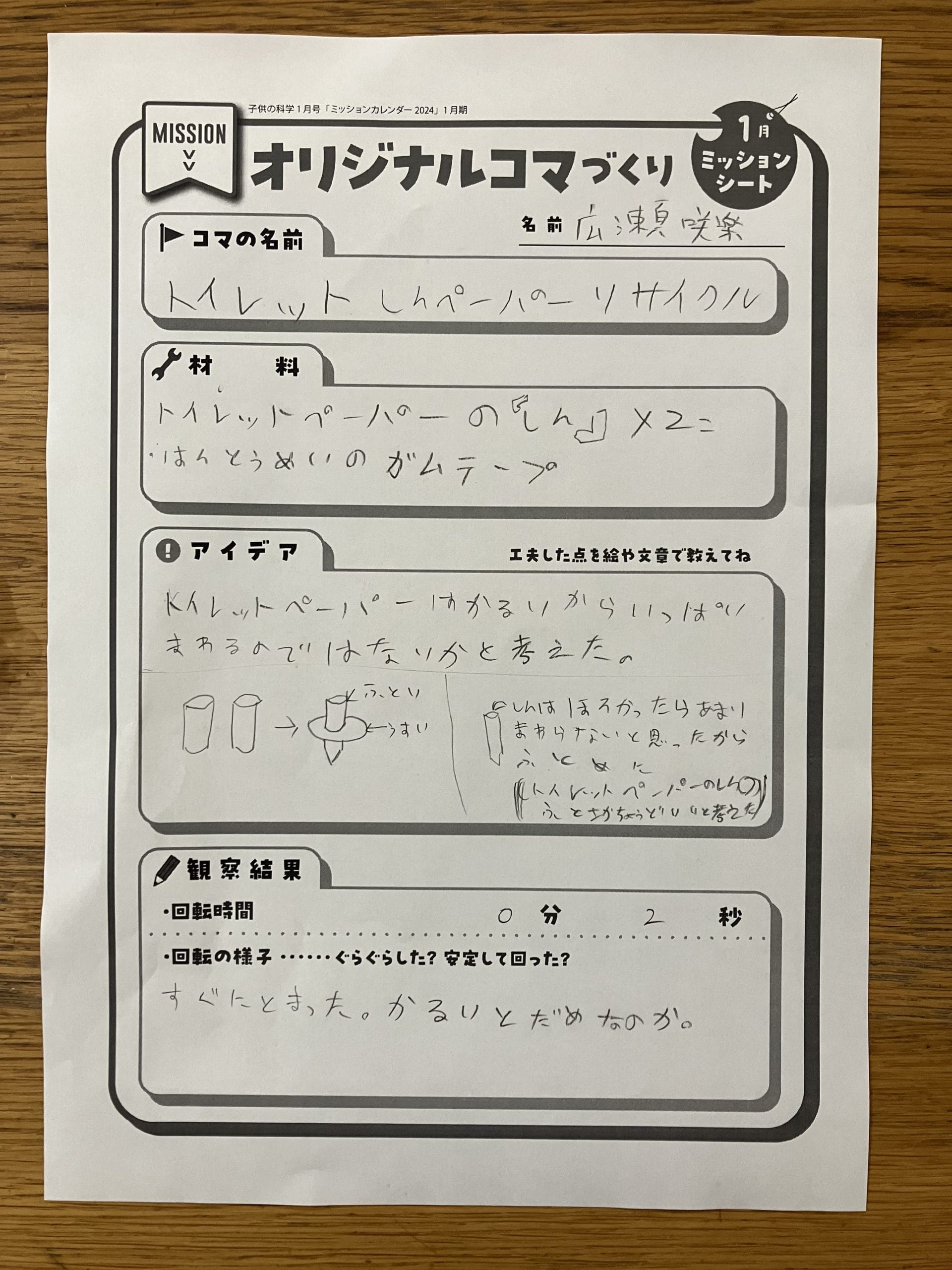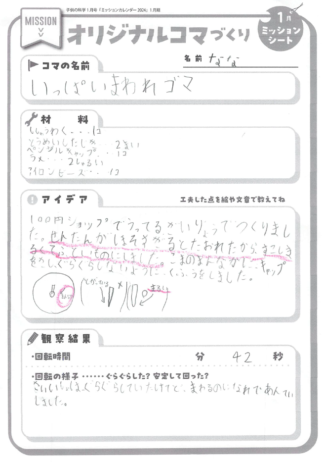 さいしょにつくったコマはしっぱいしてしまいました。でもあきらめずにやっていたらできました。ながくまわってうれしかったです。