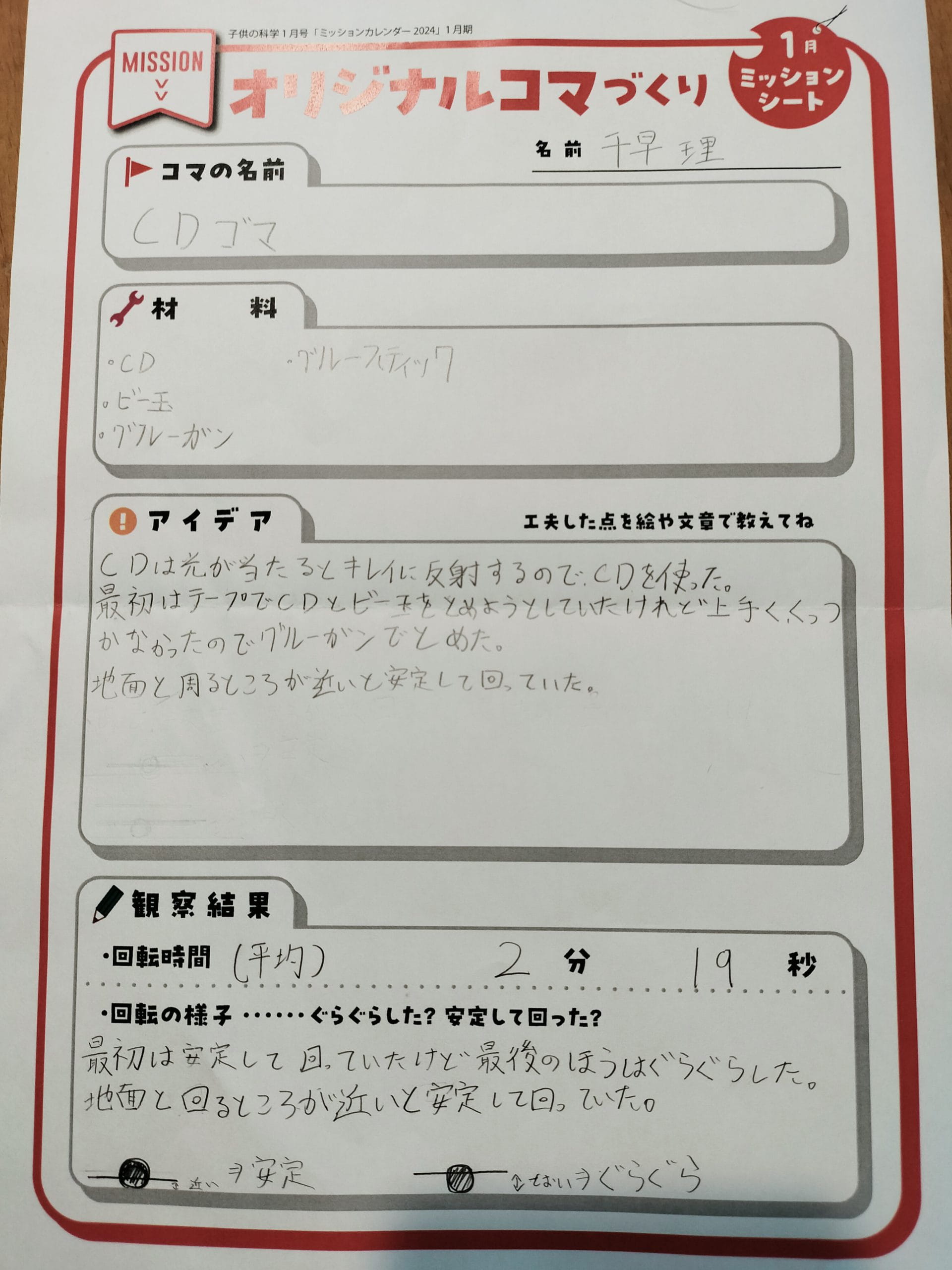 CDとビー玉をグルーガンでしっかり固定したおかげでとても長く回りましたね。ビー玉が下の場合よりも、上の場合のほうがよく回ることも自分で発見してすごいです。その理由は重心が低いほうが安定するからです。