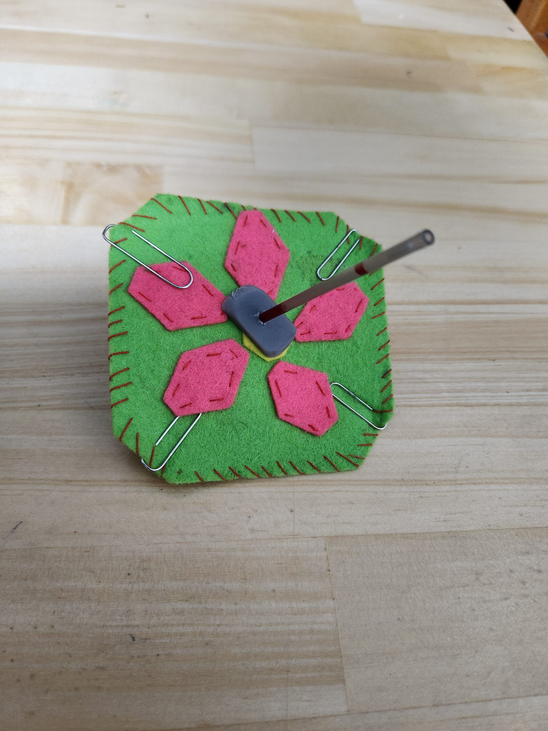 やわらかいフェルトをコマにするなんてすごいアイデア。しかも、クリップで重りをつけ、消しゴムで軸を固定するのもよく考えました。アイデアだけではなく、デザインも最高です。