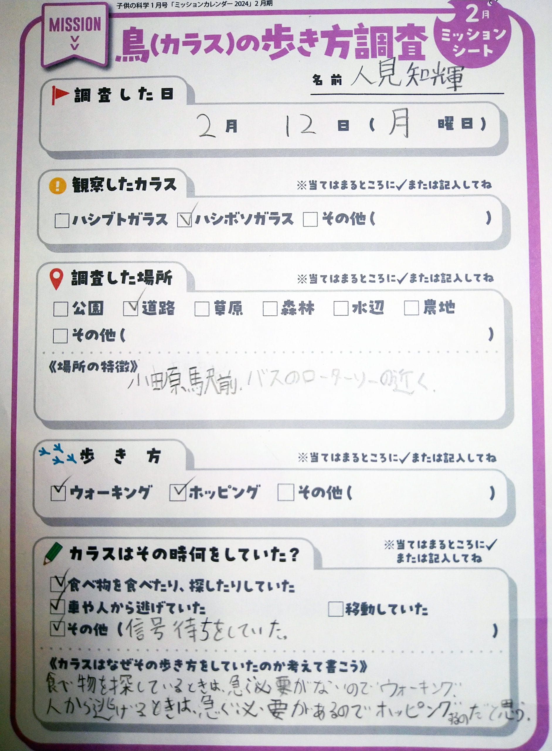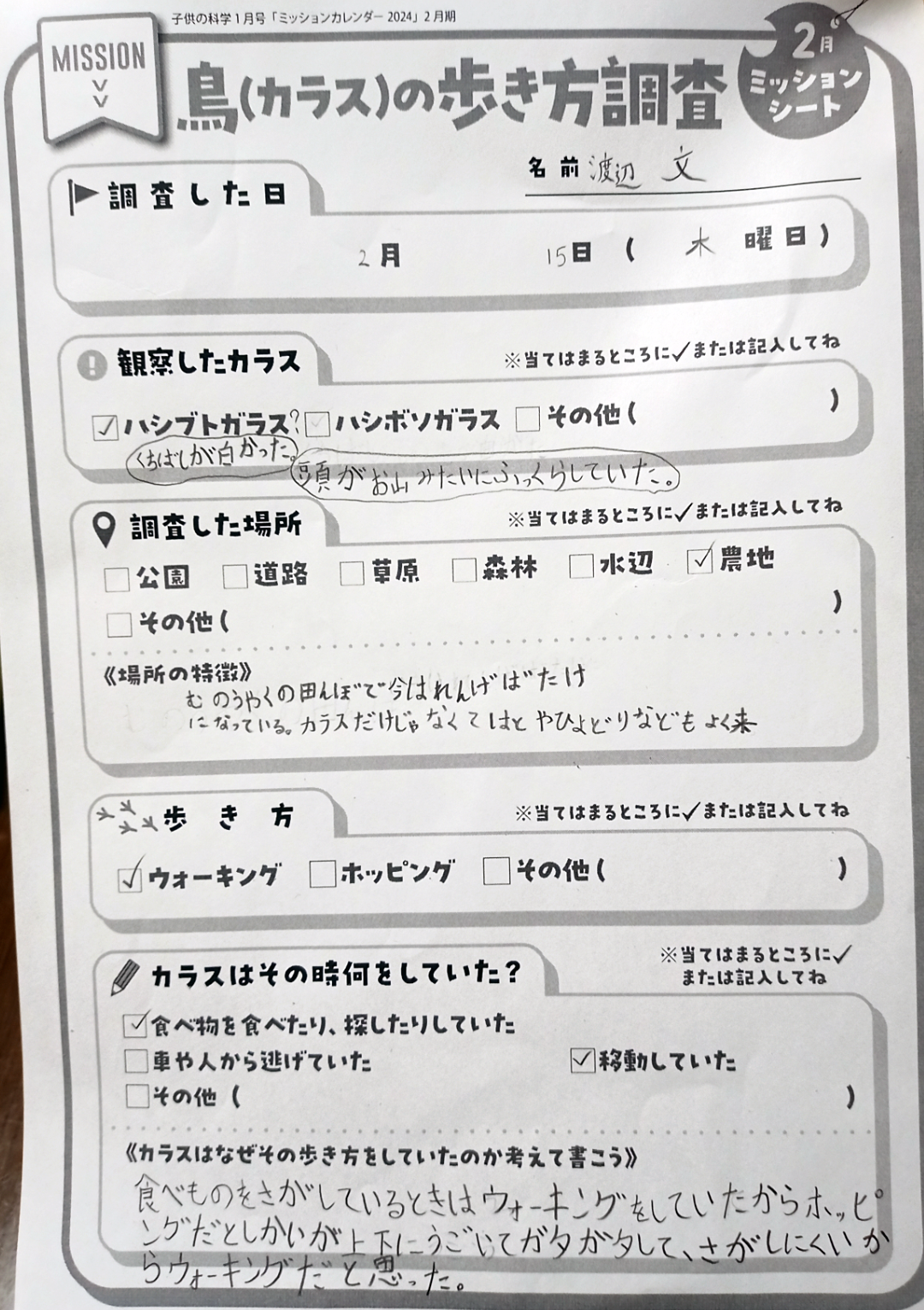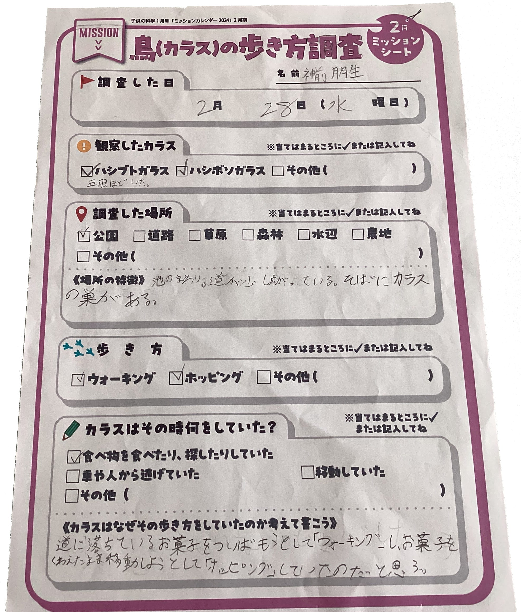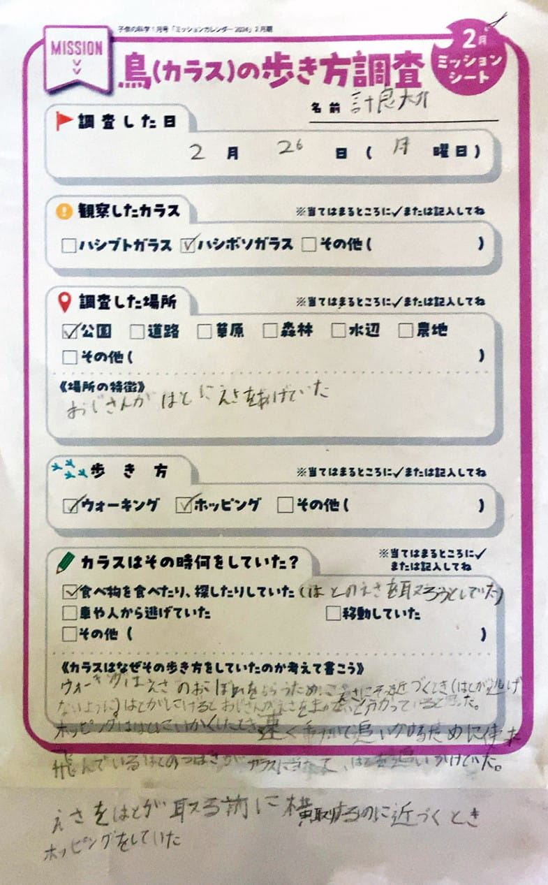 カラスだけを見るのではなく、ハトやエサとの関係で歩き方が変わることに気づいたのは素晴らしいです! 状況によってどうするかを考えているカラスの頭の良さがわかりますね。研究者のようなしっかりとした観察です。