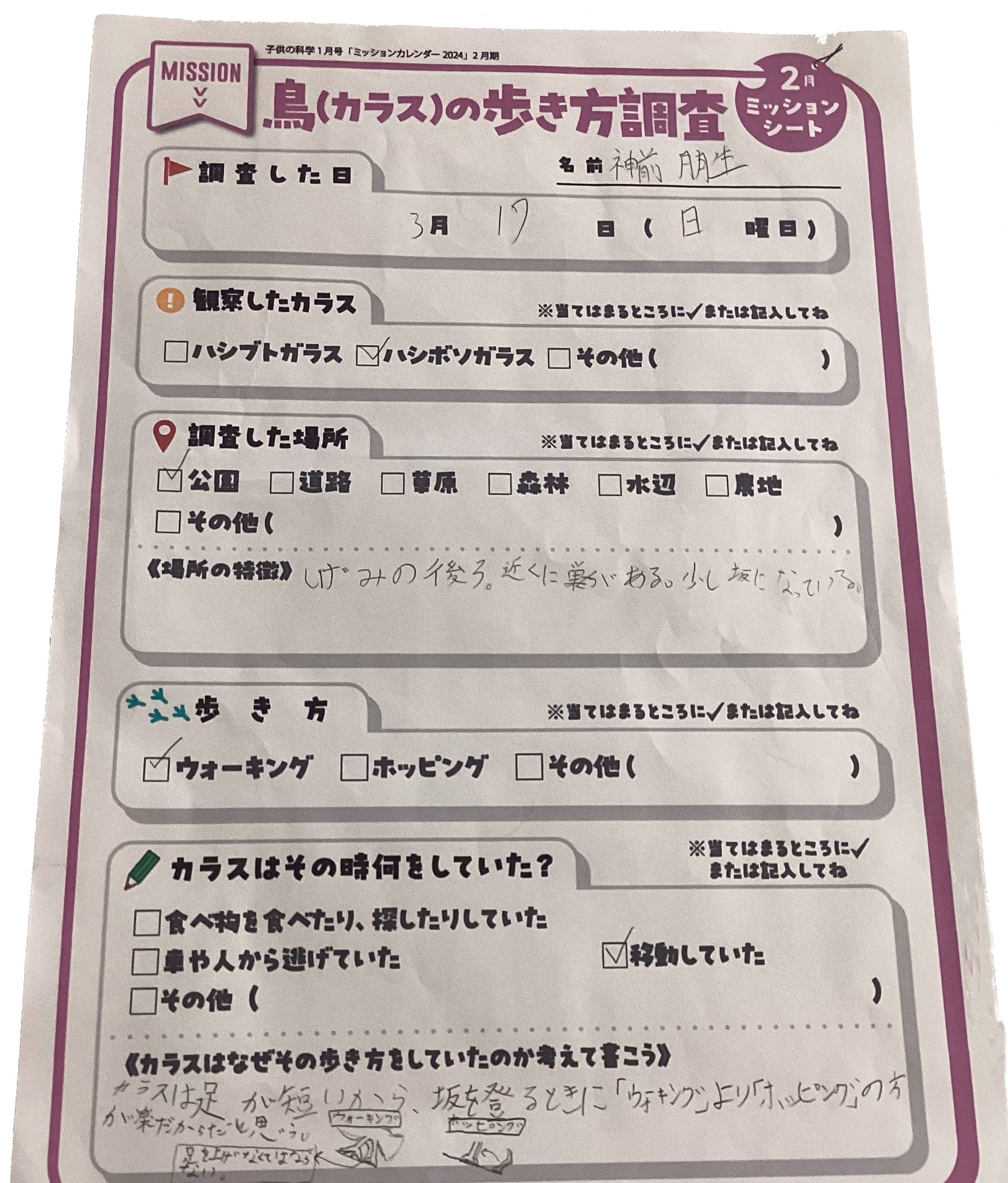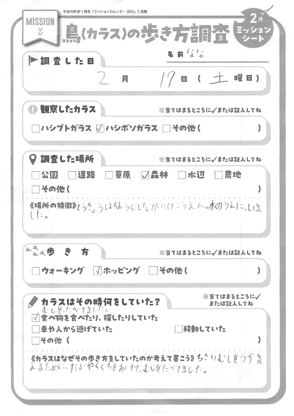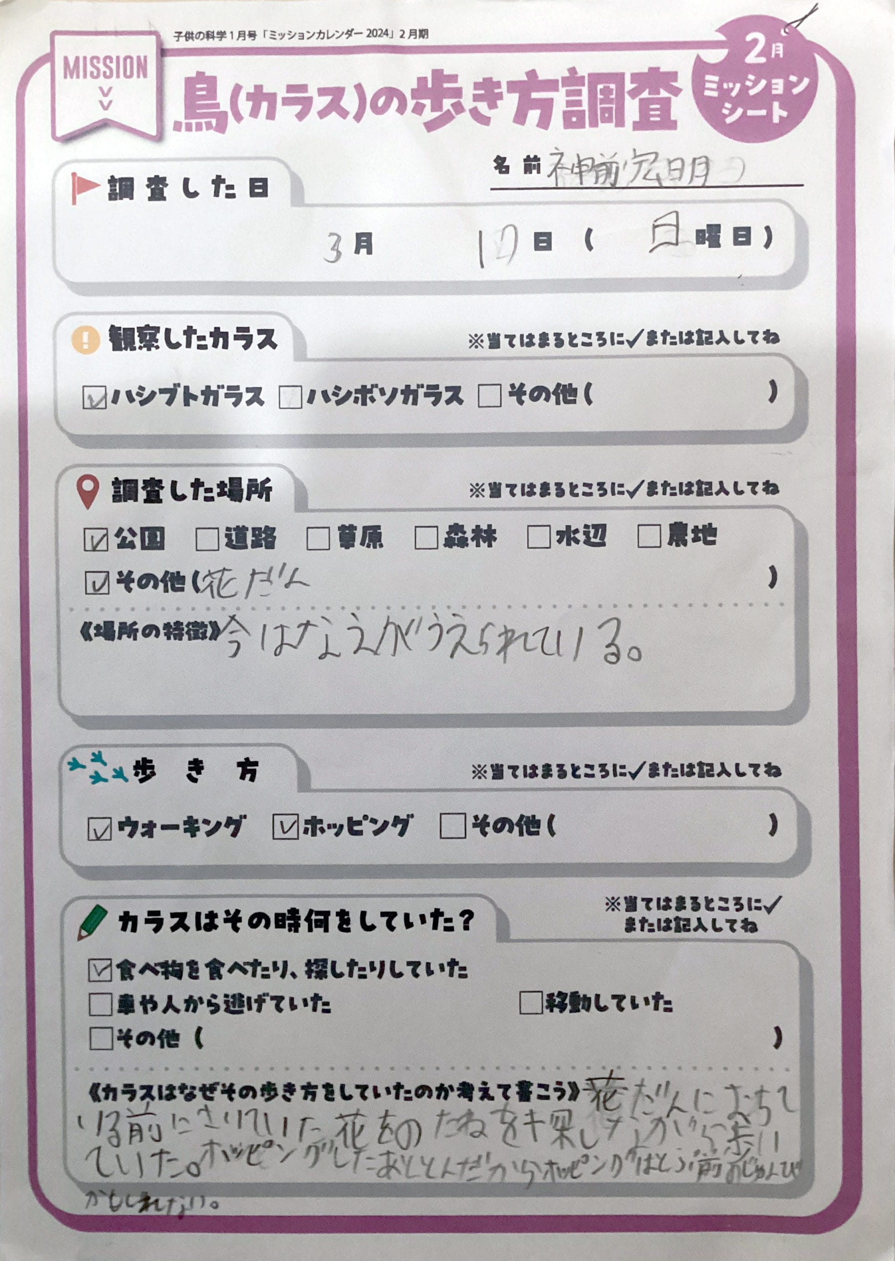 カラスだけを見るのではなく、ハトやエサとの関係で歩き方が変わることに気づいたのは素晴らしいです! 状況によってどうするかを考えているカラスの頭の良さがわかりますね。研究者のようなしっかりとした観察です。