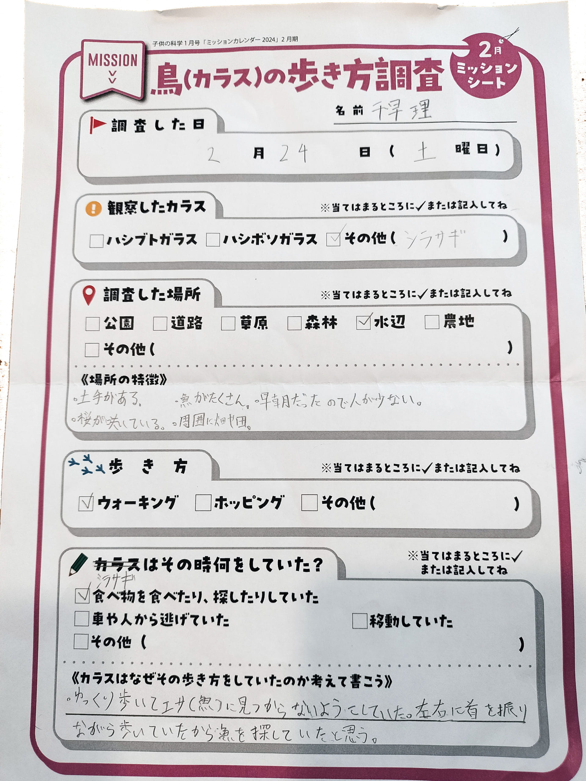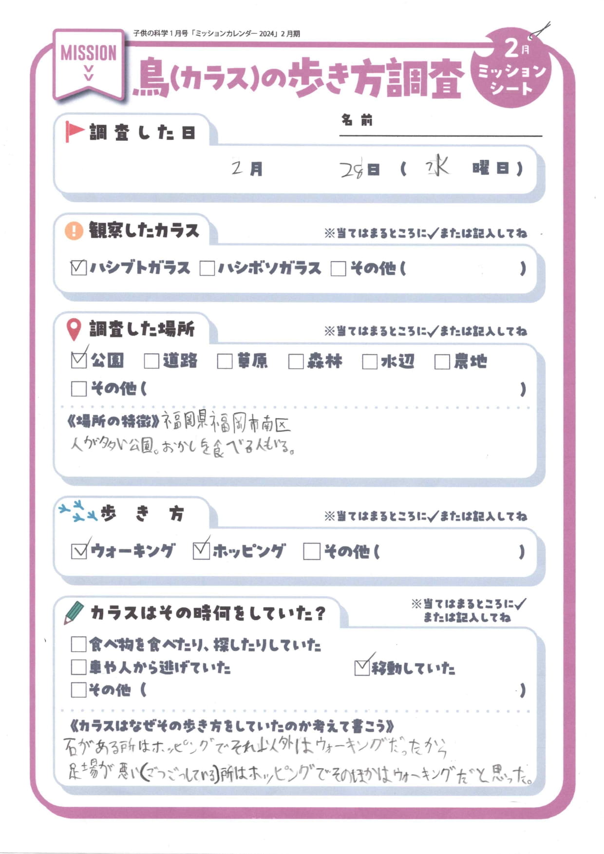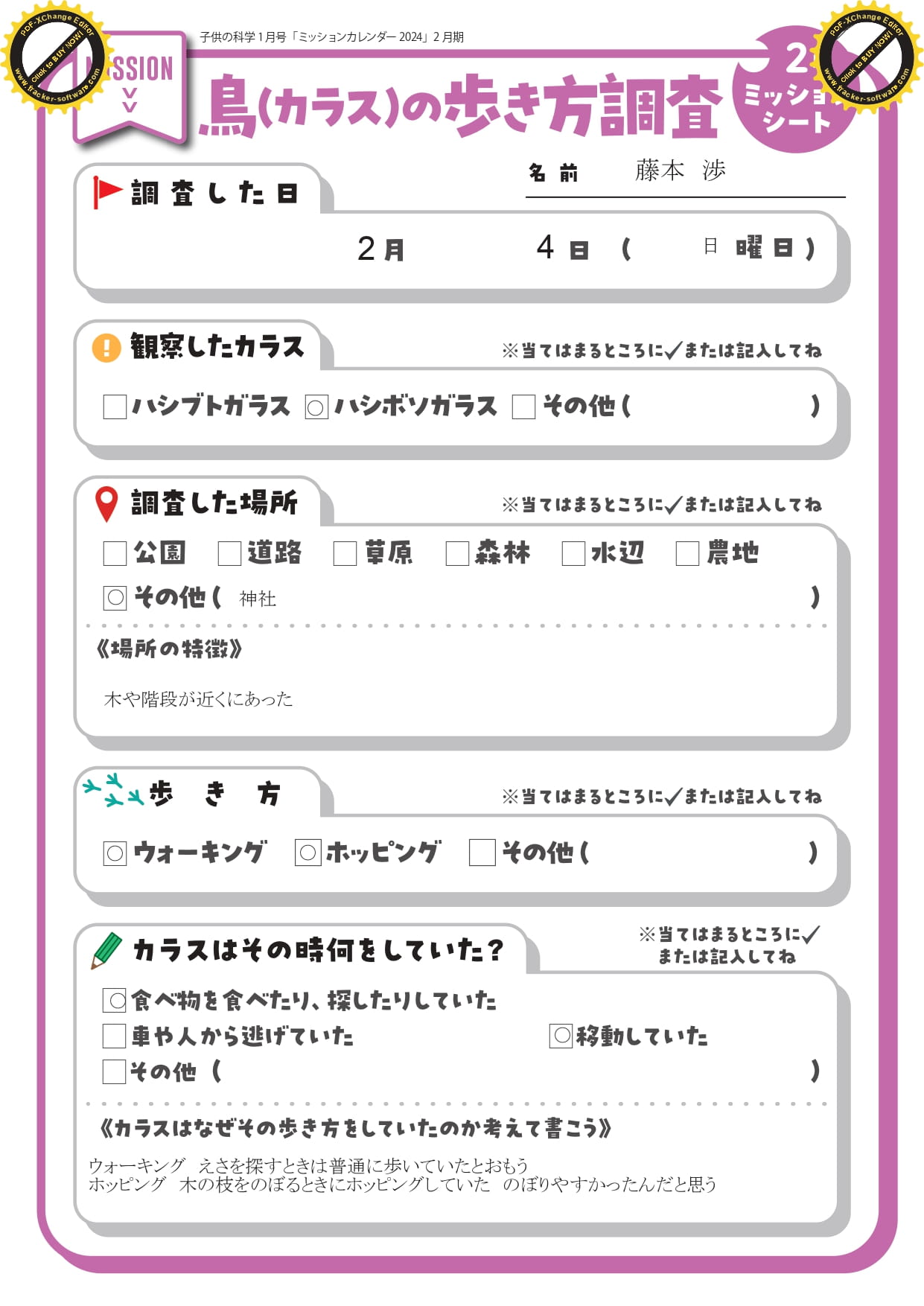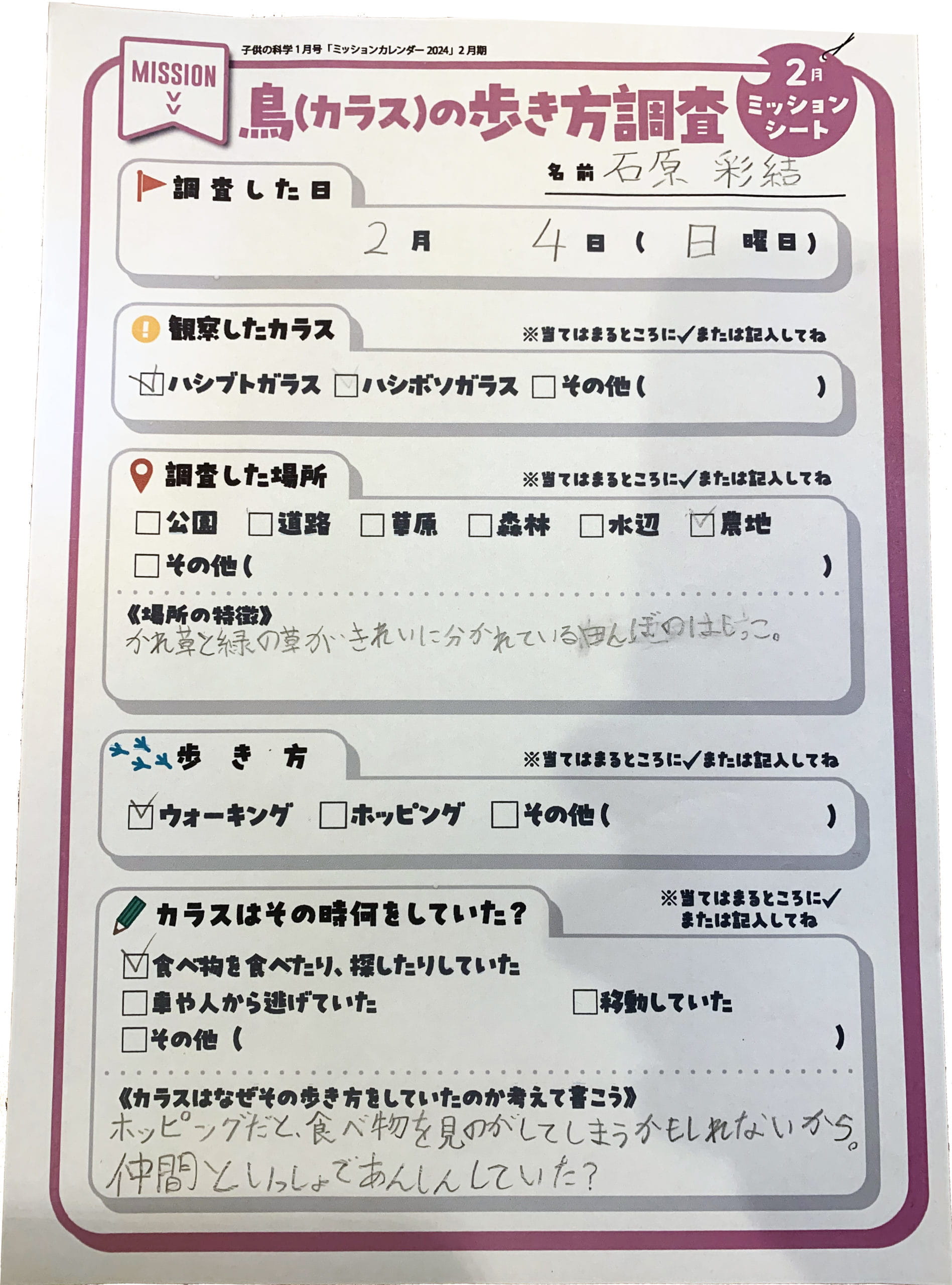 カラスだけを見るのではなく、ハトやエサとの関係で歩き方が変わることに気づいたのは素晴らしいです! 状況によってどうするかを考えているカラスの頭の良さがわかりますね。研究者のようなしっかりとした観察です。