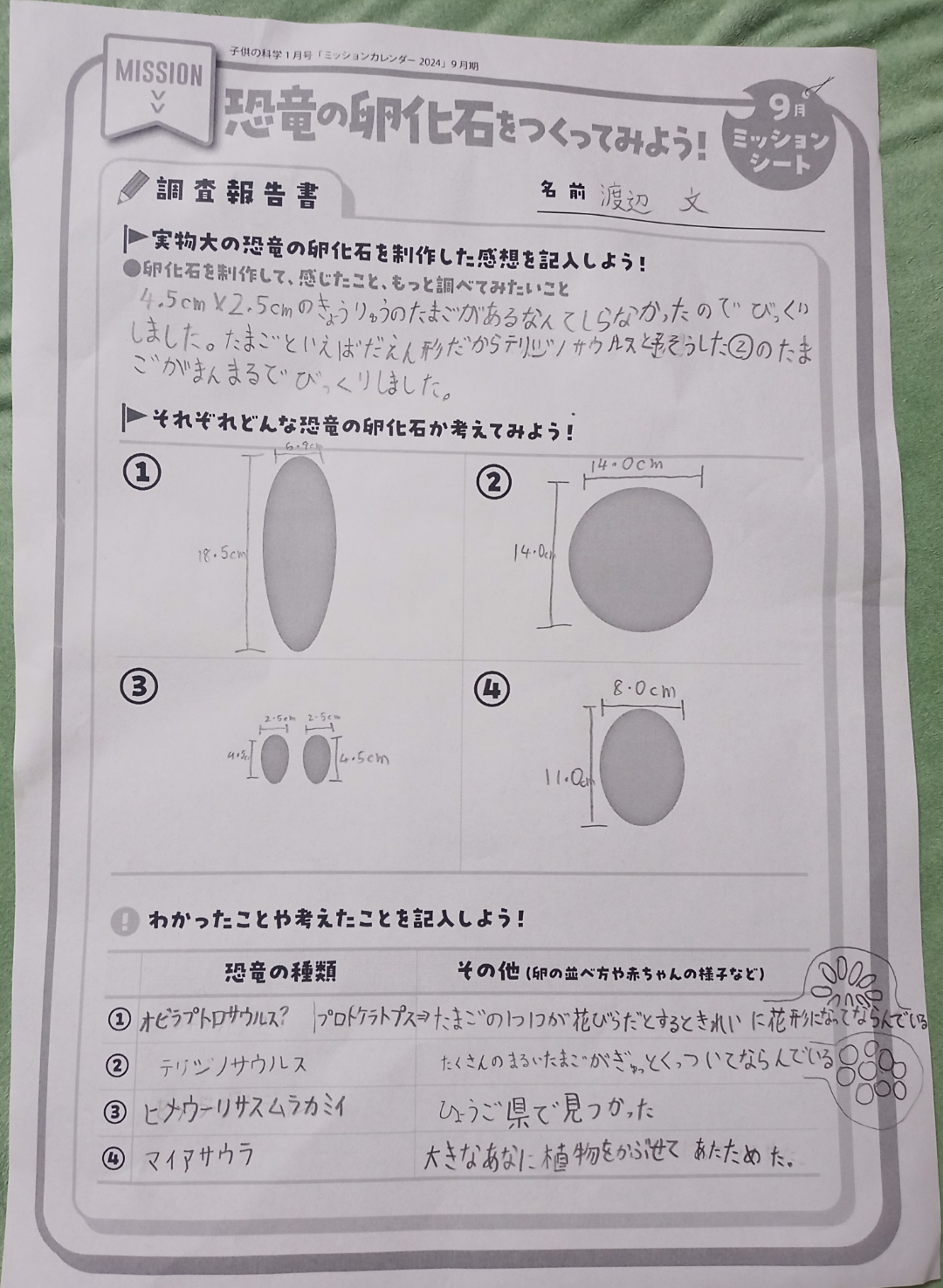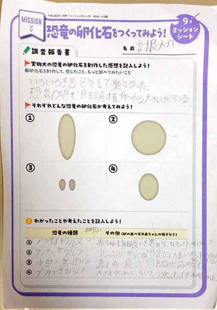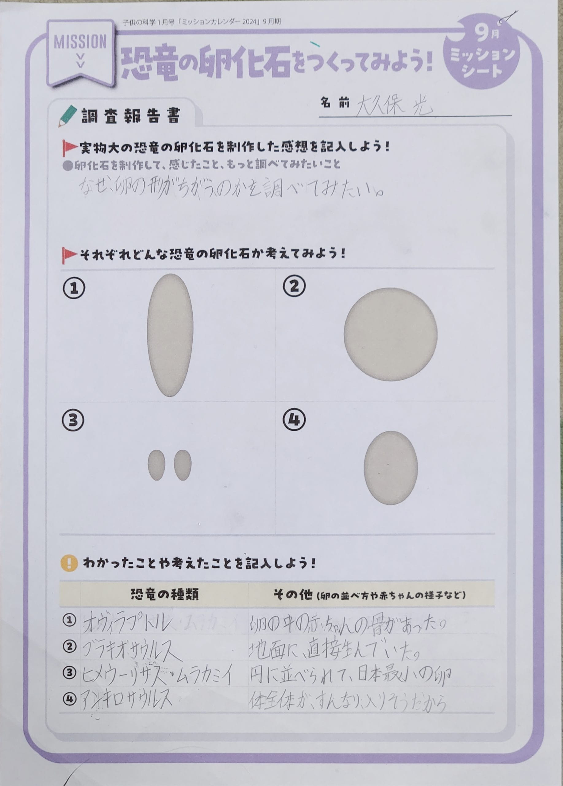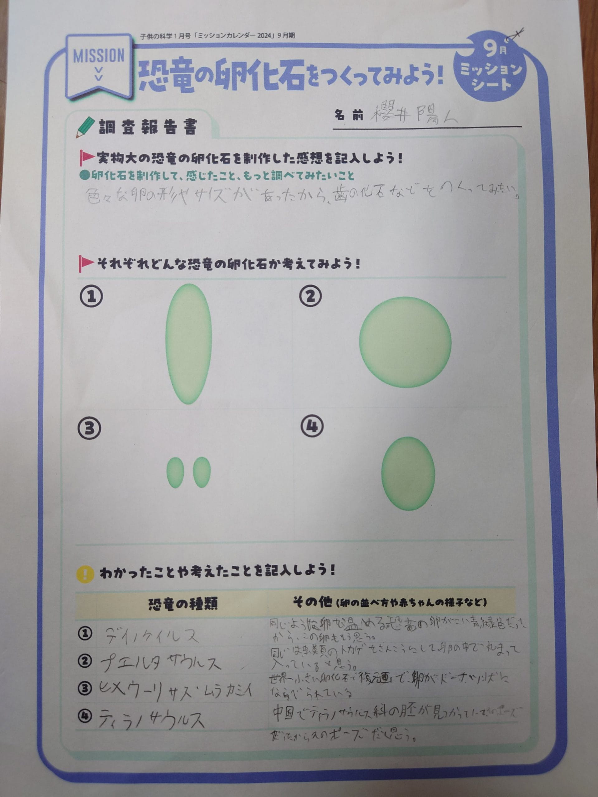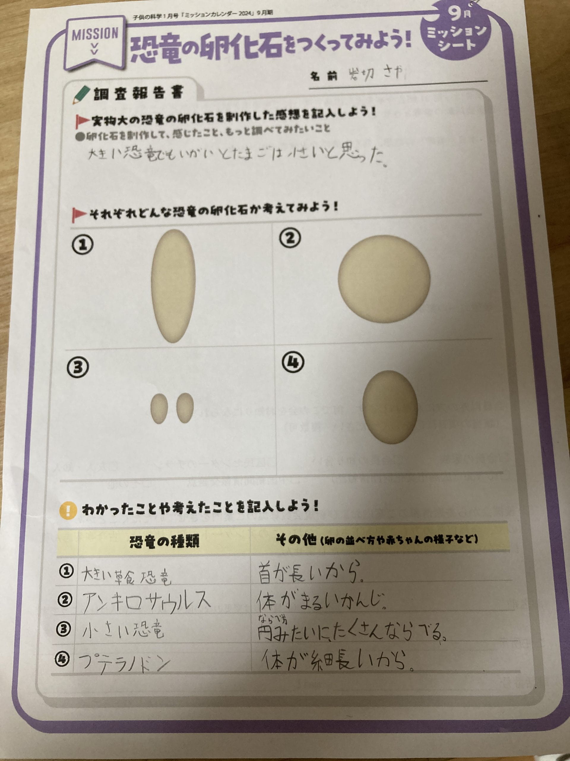 しっかりとミッションに取り組んでくれました。「大きい恐竜でもいがいとたまごは小さいと思った」とコメントしてくれたけれど、まさにその通りで、恐竜の卵は体のわりにとても小さいんです。なぜそうなのか考えてみると、新しい発見があるかも。