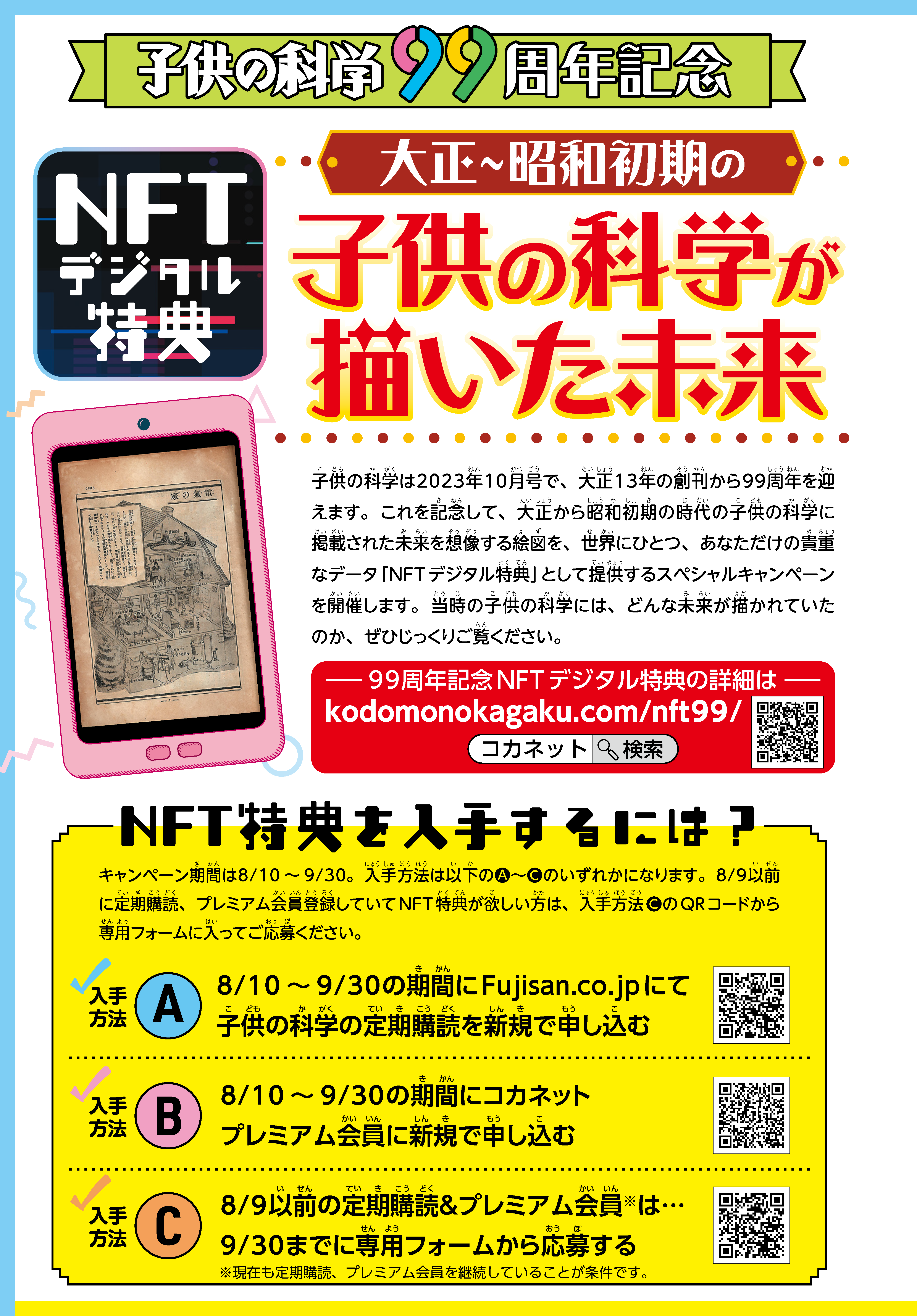 8月9日より以前に子供の科学をFujisan.co.jpにて定期購読している方、またはコカネットプレミアム会員に登録済みの方(いずれも現在も継続して契約していることが条件。解約された場合は対象外です)で、NFTデジタル特典を取得希望の方は、以下の専用フォームよりお申し込みください。