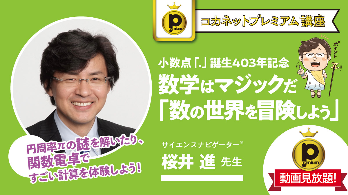 今回のテーマは、「数の世界の冒険」だ。11月号の特集では、パイ(π)王国に連れていかれたタカシくんがいろいろな計算に挑戦していたけど、今回の講座でも関数電卓の計算体験ができるよ! また、円周率πの謎解きや、誕生して403年になる小数点の誕生秘話など、学校では習わない算数・数学の話が盛りだくさん。数と楽しく遊んでいると、いつもの授業やテスト勉強もずっとおもしろくなるかも!? 動画はコチラ
