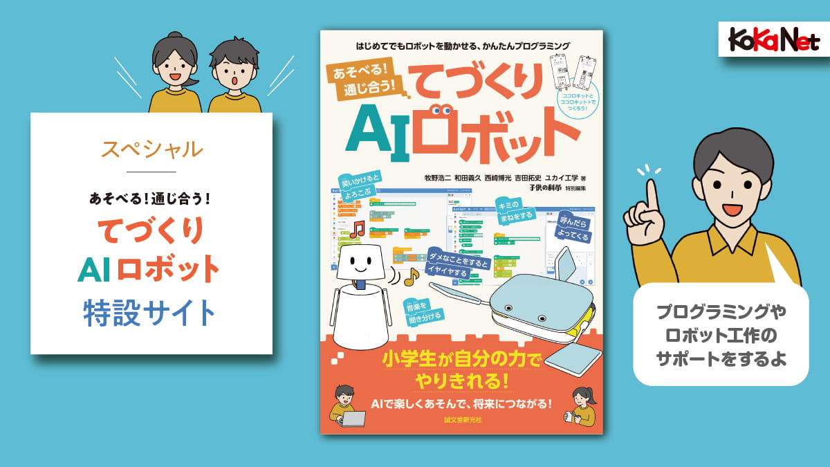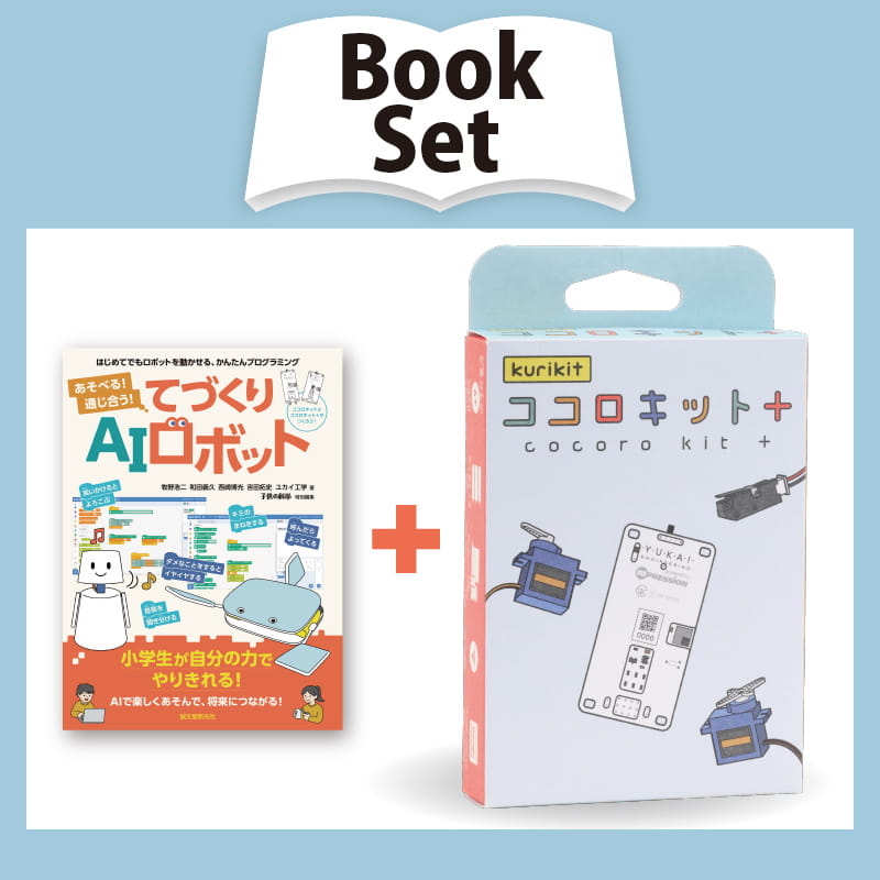 指定した角度で動かせるRCサーボモーターや、スイッチなどがセットになっているキット「ココロキット+」に、小学生からできるAIロボットのつくり方を解説した書籍『あそべる! 通じ合う! てづくりAIロボット』をセットにしたものです。ロボット工作やプログラミングがはじめてでもチャレンジできて、AIで動くロボットをつくることができます!「ココロキット+」では、書籍で説明しているロボット「カミコプくん」をつくることができます。