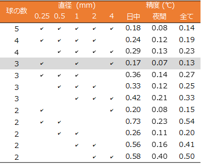 研究グループは野外実験を繰り返して、さまざまな大きさの球形の組み合せを調べたところ、直径が「1対4対16」の比となる、0.25mm、1mm、4mmの3種類の球形センサーを組み合わせたときが、もっとも実際の気温との差が小さくなることをつきとめました。