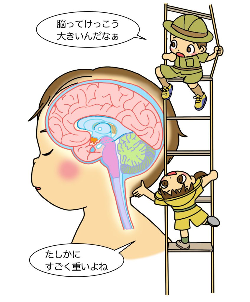 あれって、体がフワッと浮いて、とてもおもしろい! 子供もおもしろいし、やっている大人もおもしろい。だから、何回もやってしまう。実はあの「たかいたかーい」は、頭の中の脳がはげしく揺れてしまって、最悪の場合傷めてしまうことがあるのです。だから、「たかいたかーい!」には注意が必要なのです。