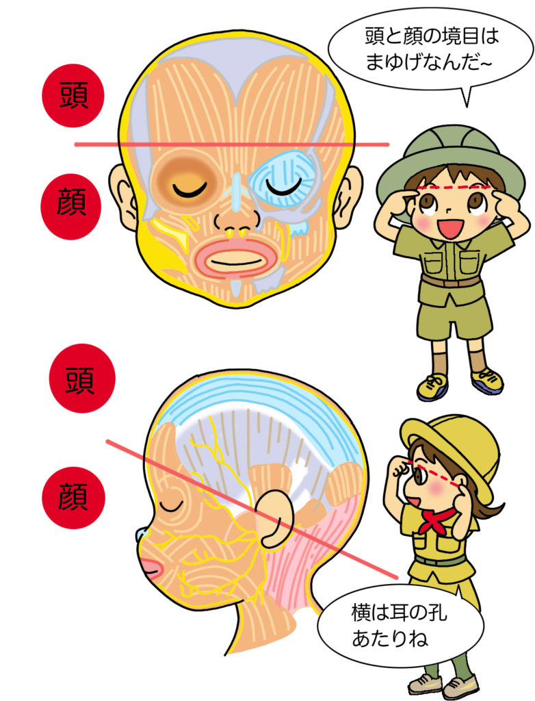 ちなみに、顔と頭の境目は前髪の生え際あたりと思っている人が多いけれど、正しくは、眉毛のあるあたりです。ですから、おでこは顔の一部ではなく頭の一部となります。