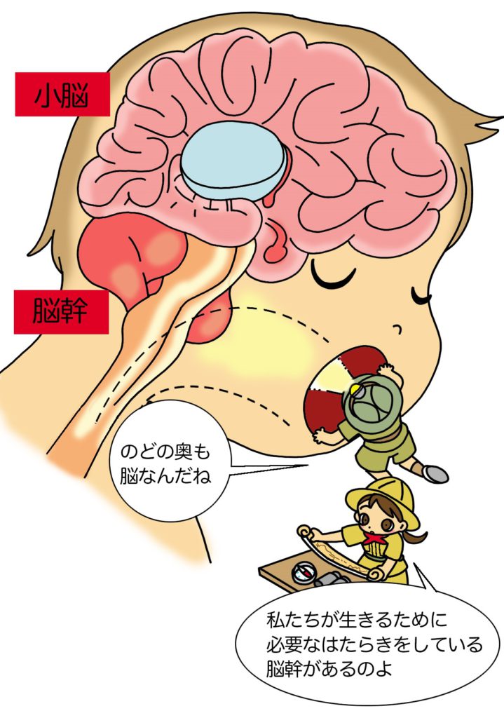 」という場所があります。脳幹は、息を吸ったり吐いたりする「呼吸」運動や、心臓の動きを調節するなど重要な役割を果たしています。もしも先が細く尖った棒状のものが咽や鼻の奥に刺さってしまうと、とんでもないことになってしまいます。あそびでも冗談でも何でも、そのようなものを口にくわえて走り回るなどの真似は危険ですから、絶対しないようにしましょう。