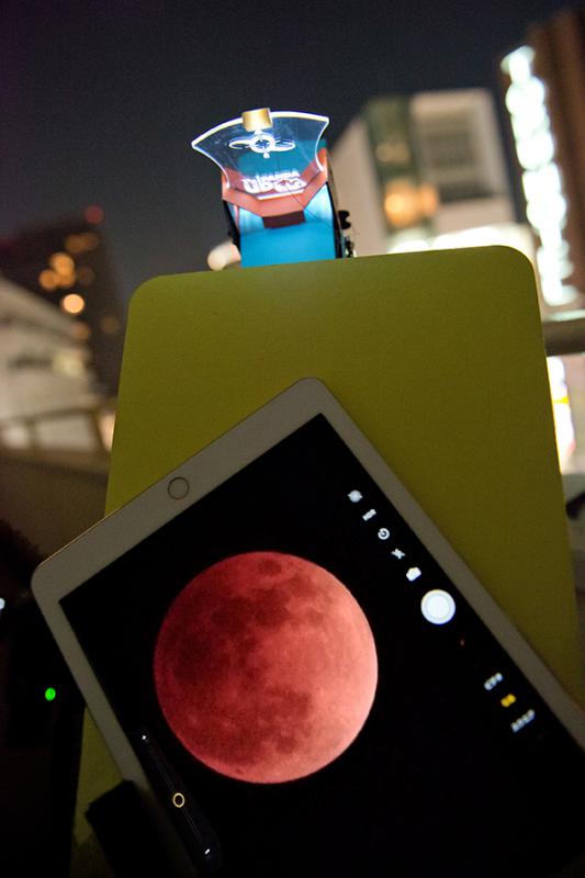 こ~んな感じで、タブレットやスマホを装着して、きれいな皆既月食がクレーターまでばっちり撮影できちゃいます。