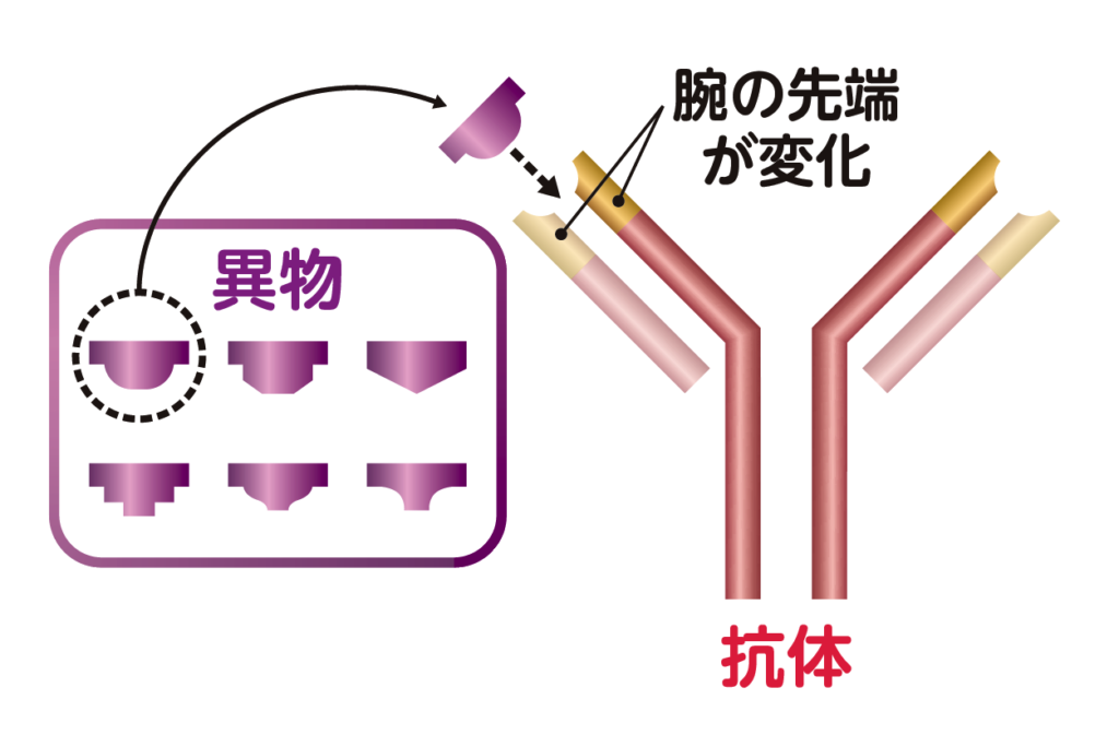 アルファベットのY字型をした抗体の開いた腕の先端が、異物に応じて変化するしくみになっており、個々の異物にだけ結合する抗体をつくりだしていたのです。