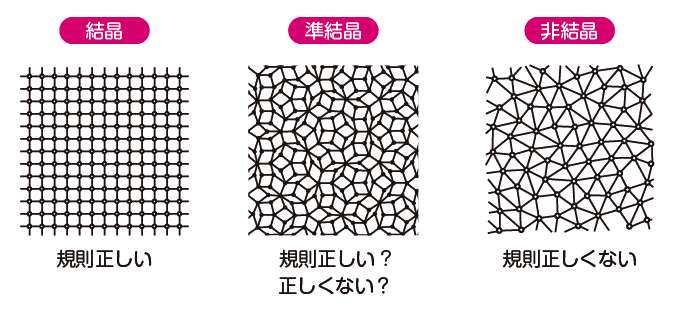 私たちの身の回りの固体は、原子が規則正しく並んだ「結晶(クリスタル)」と、原子の並びが乱雑な「非結晶」の2種類に分けられてきました。例えば、ナトリウムと塩素が規則正しく並ぶ食塩(塩化ナトリウム)は、結晶の代表格といえます。ダイヤモンドも炭素が規則正しく並んでいる結晶です。一方、非結晶の代表格といえるガラスは、主成分の二酸化ケイ素がバラバラに結合しています。
