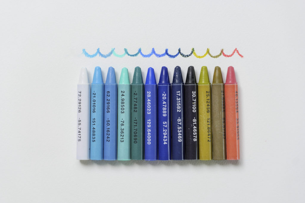 この12色に色の名前はありませんが、どの色にも理由があります。クレヨンにはその色の海の場所をあらわす緯度と経度が書かれています。