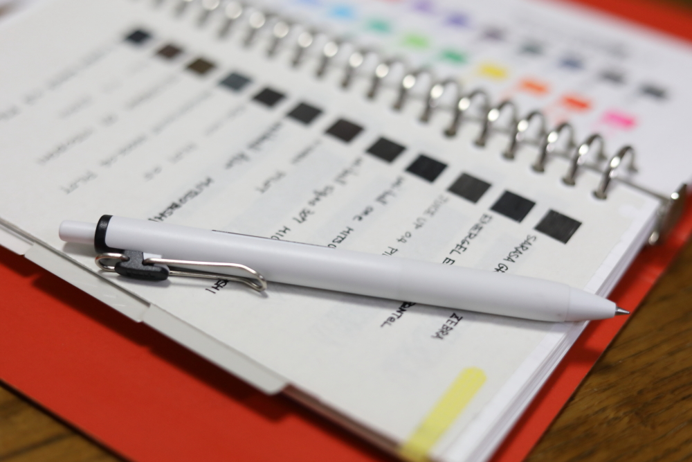 これはインクがとても黒いんです。同じ黒のボールペンでも、色の違いがあることを知っていますか? 塗り比べてみるとよくわかると思うのですが、赤みがかった黒や青っぽく見える黒、表面の光り具合もペンによって違います。このインクは粒子